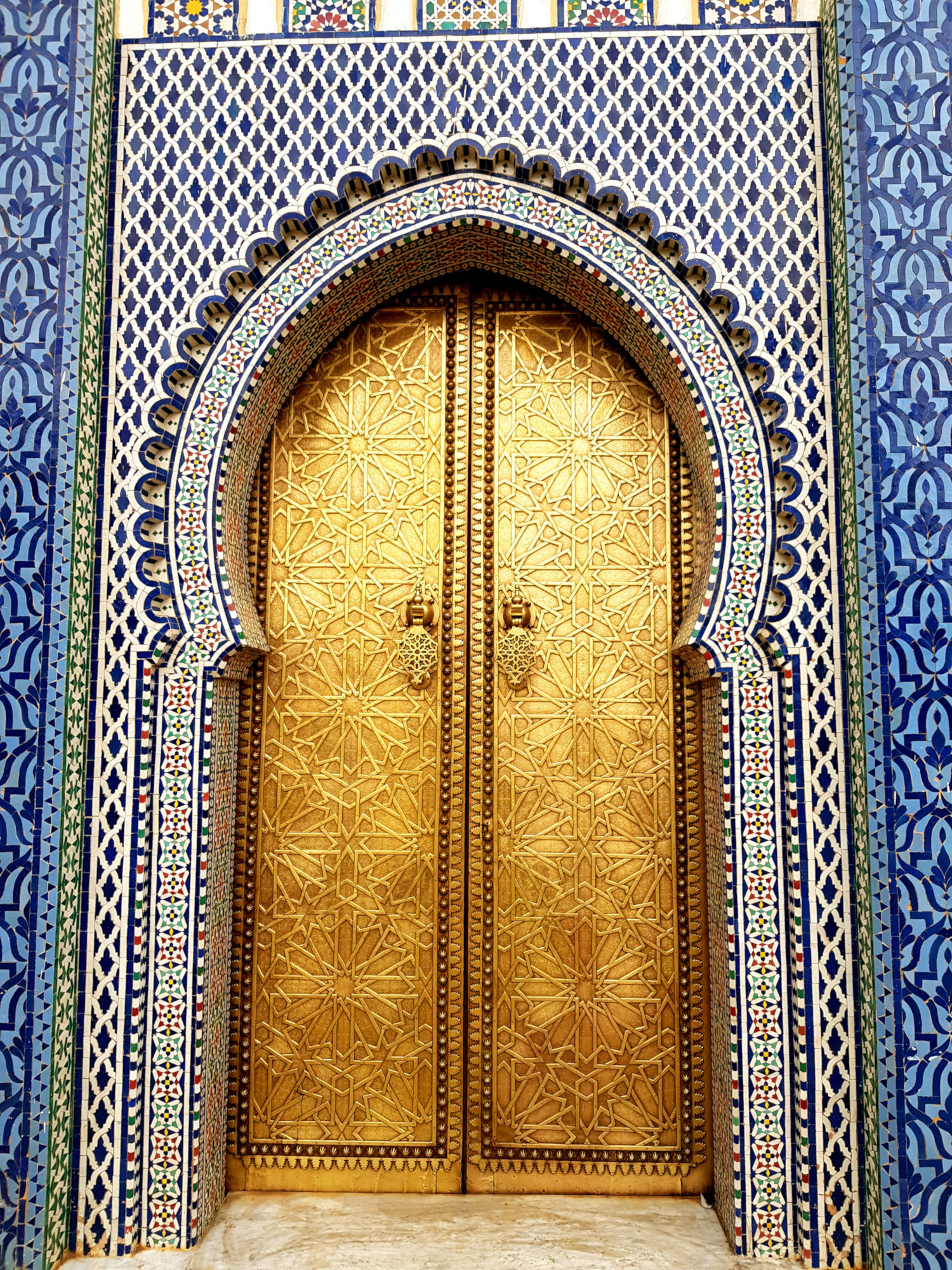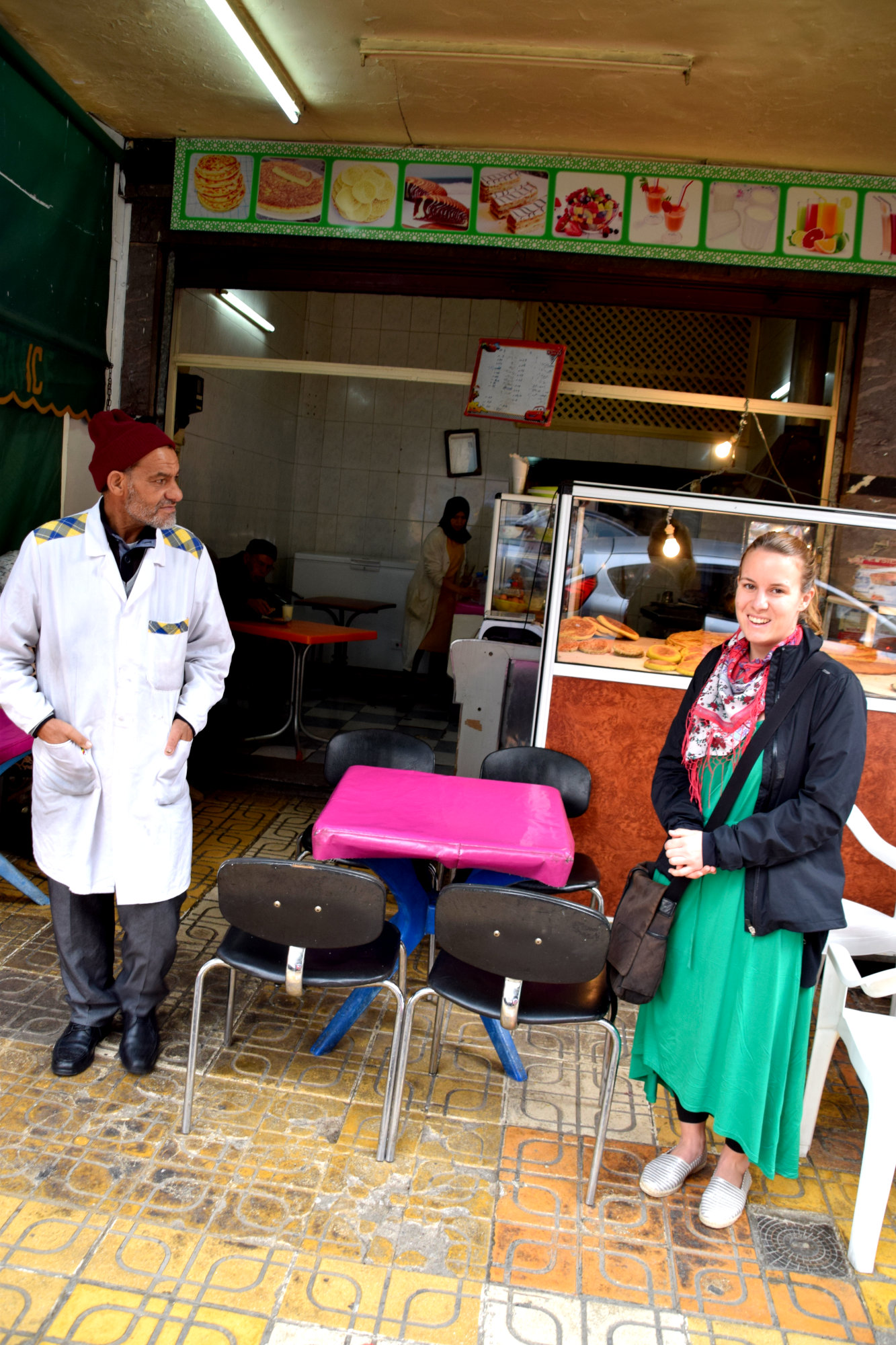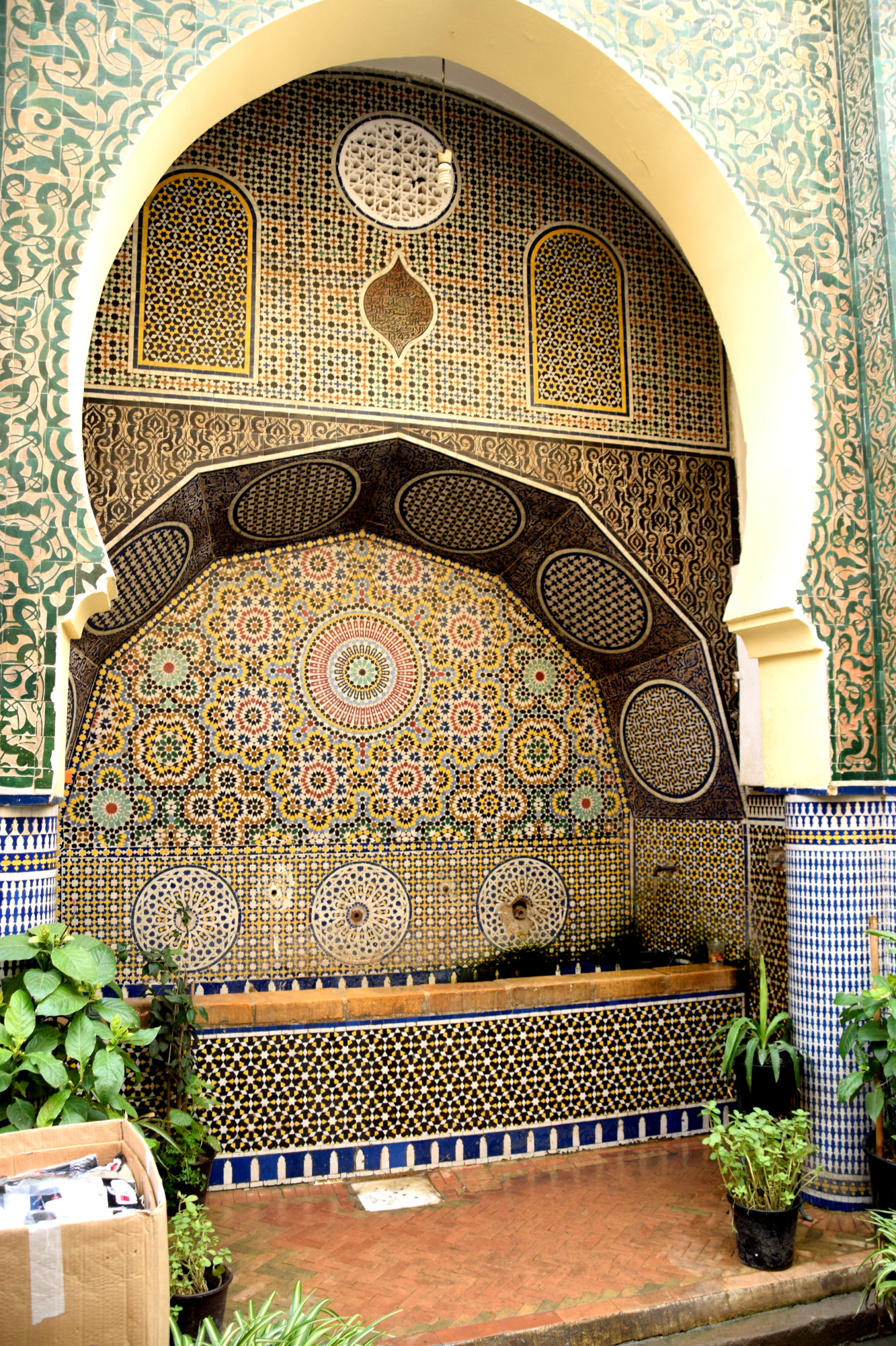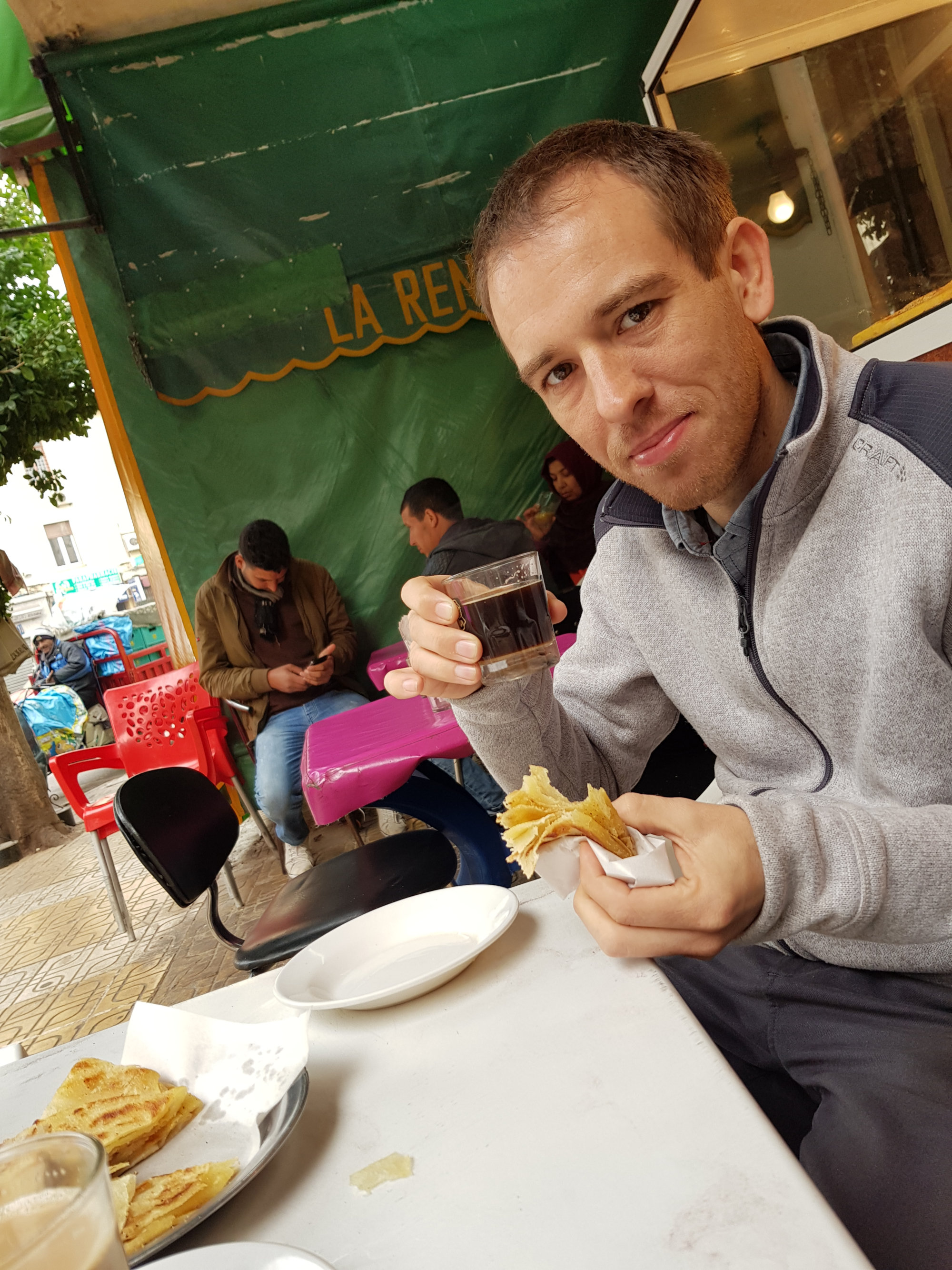 Am nächsten Morgen brechen wir früh auf, um Fès zu besichtigen. Rotkäppchen bleibt am Campingplatz zurück, während wir per Taxi in die Stadt fahren wollen. Doch erst einmal müssen wir uns mit den örtlichen Taxi-Gepflogenheiten vertraut machen. Es gibt nämlich Petit Taxi und Grand Taxi. Während erstere einen an die gewünschte Stelle fahren, nimmt einen zweiteres auf einer fest definierten Strecke mit und man muss dem Fahrer sagen, wann man aussteigen möchte. Ohne dies zu wissen, geraten wir natürlich erst einmal an ein Grand Taxi – bei dem uns der Fahrer etwas verdutzt ansieht, als wir ihm sagen, wo er uns genau absetzen soll. Doch Dank der Vermittlung durch einen weiteren Fahrgast auf Französisch klärt sich das Missverständnis schnell auf. Immer wieder bleibt der Fahrer stehen, um neue Passagiere einsteigen und andere aussteigen zu lassen – eigentlich ein ganz praktisches System, dank dem man für wenige Dirham von A nach B gelangt. Wir steigen schließlich in der Neustadt aus, um uns in der Nähe des örtlichen Marktes ein Frühstück zu gönnen. Schnell werden wir fündig & bekommen neben Kaffee „nuss-nuss“, d.h. halb Milch, halb Kaffee noch Honig-Crêpes und Omelette mit Käse. Dabei wird traditionell kein Besteck verwendet, sondern man isst mit Hilfe der Hände bzw. der rechten Hand, da die linke Hand als unrein gilt. Das Café liegt perfekt, um das Straßentreiben zu beobachten und Details des örtlichen Lebens wahrzunehmen, das einem sonst an den meisten Touristen-Plätzen komplett verborgen bleibt. An der einen Straßenecke hat ein Schuhputzer seinen Schuhkasten aufgebaut und wartet auf Kundschaft. Als ein vermeintlich reicher Kunde mit seinem Auto vorfährt und seine Schuhe, die er scheinbar zur Reparatur dagelassen hatte, abholt, ist der Schuhputzer so dankbar, dass er das entgegengenommene Geld (scheinbar nur ein paar wenige Münzen) küsst und schnell einsteckt. Eine weitere Beobachtung ist das im Koran als Gebot festgeschriebene Teilen mit Armen. Dabei soll der, der hat, auch stets mit dem Teilen, der schlecht gestellt ist. Dies beobachten wir, als ein junger Mann vor uns im Café sitzend plötzlich eine ältere Frau, die vorher unscheinbar an einer Ecke gewartet hatte, zu sich ruft. Er fragt sie auf Arabisch, ob sie Hunger habe und lädt sie anschließend auf ein warmes Frühstück ein. Der Wirt eilt herbei, weist ihr einen Tisch zu und die Frau nimmt dankend das Frühstück entgegen. Eine Tat, bei der man bei uns im Zweifel böse Blicke des Café-Betreibers erwarten dürfte. Die aber meinen größten Respekt verdient hat und den islamischen Glauben mit all seinen zum Teil fragwürdigen Auslegungen in meiner Gunst steigen lässt.
