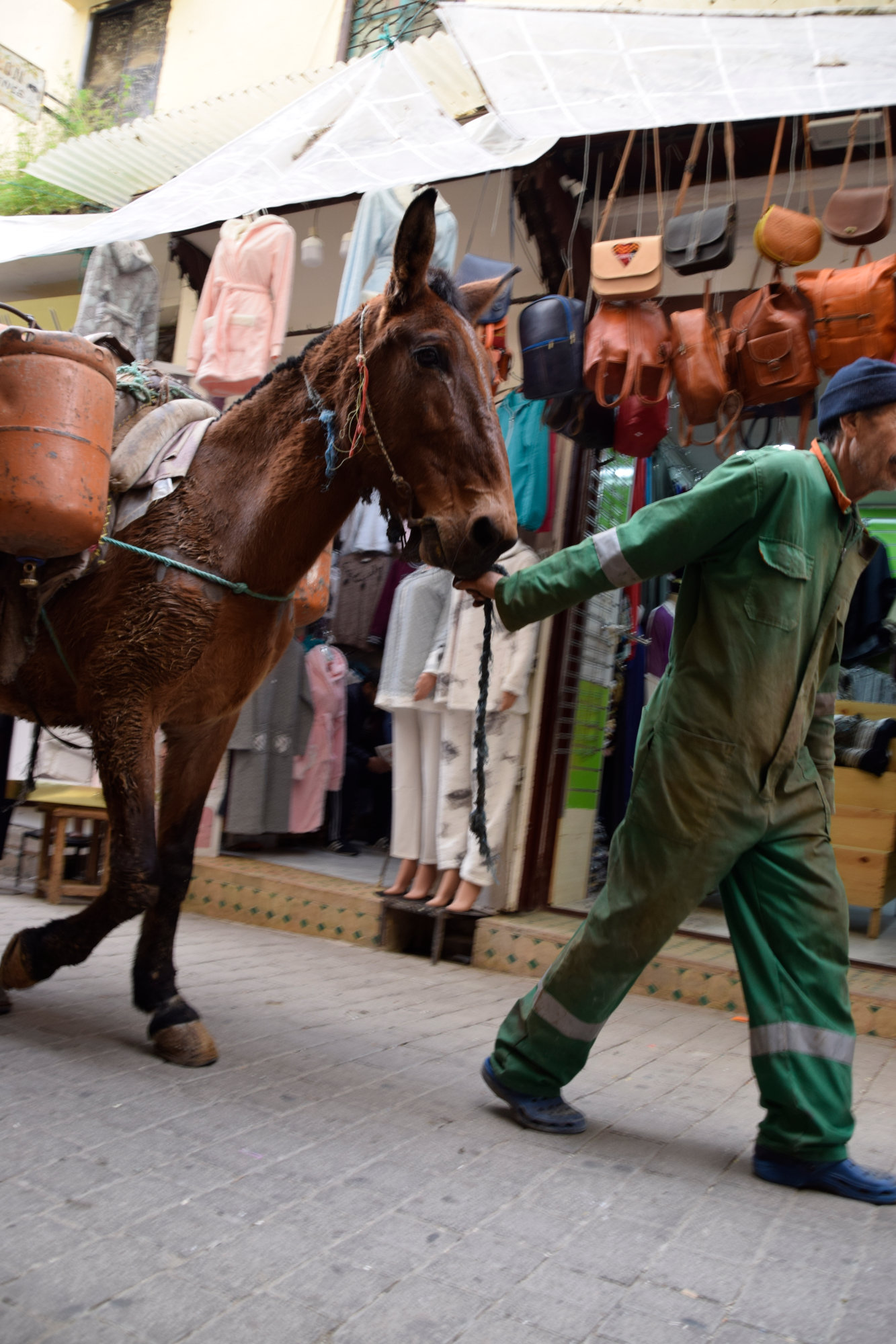 Frisch gestärkt starten wir schließlich die Erkundungstour durch Fès. Zu Fuß verlassen wir die Neustadt und wandern durch die beiden Altstädte von Fès – dabei geht es vorbei an hohen Stadtmauern, prunkvollen Toren und durch enge, zum Teil dunkle Gassen, wo allerhand Ware feilgeboten wird. Dabei kommt einem immer mal wieder ein mit Gasflaschen beladener Pferdetreiber entgegen, der scheints die örtlichen Läden und Wohnhäuser mit Gas beliefert. Oder aber ein Esel voll beladen mit Flachbildschirmen – ein skurriler Anblick.