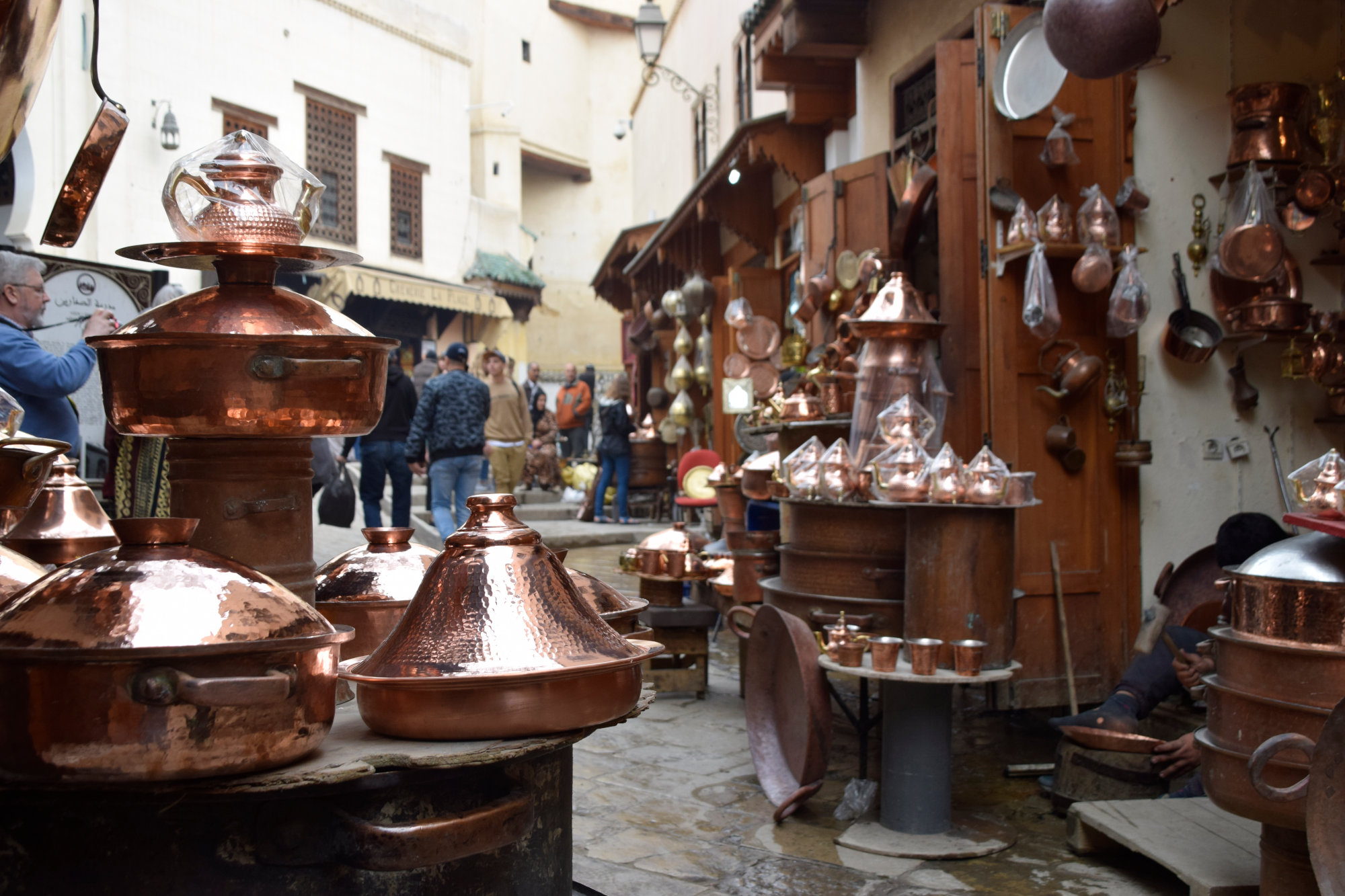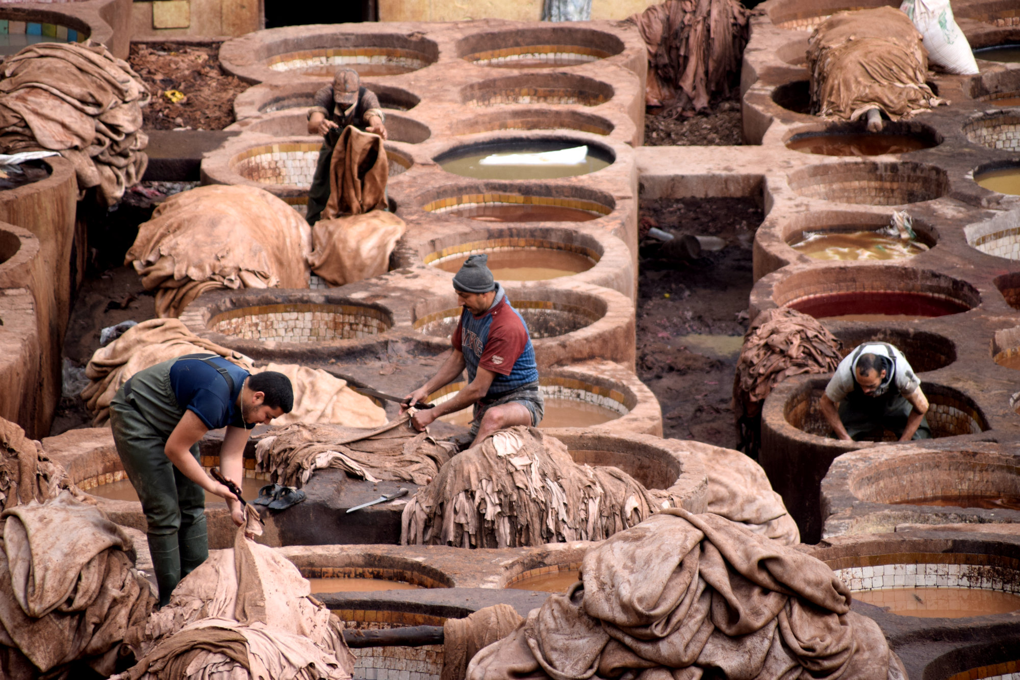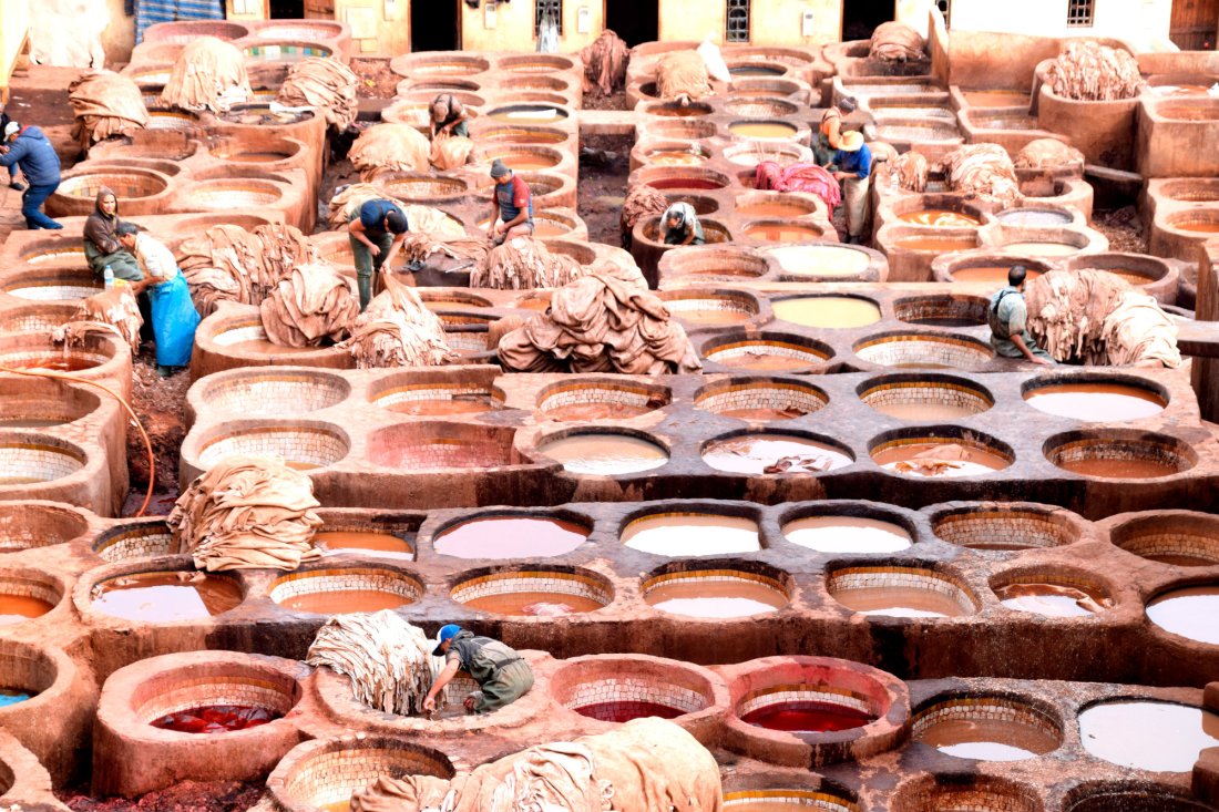 Schließlich landen wir im Handwerkerviertel – während an dem einen Platz Kupferschalen geklopft werden, empfängt uns ein paar Gassen weiter ein etwas unangenehmer Geruch. Hier befindet sich das Gerberviertel – ein Knochenjob, der noch immer von Hand ausgeführt wird und aufgrund der natürlichen wie chemisch hergestellten Laugen nicht gerade gesundheitsfördernd ist. Dabei wird das Leder zuerst in eine Lauge gegeben, um es vom Tierhaar zu befreien und weich zu machen, später wird es in kleinen Becken gefärbt und dann zum Trocknen ausgelegt. Der Beruf wird dabei von Generation zu Generation weitergegeben. Ein faszinierendes Schauspiel, das man von den Balkonen der Lederwarenverkäufer gegen einen kleinen Obolus beobachten kann.