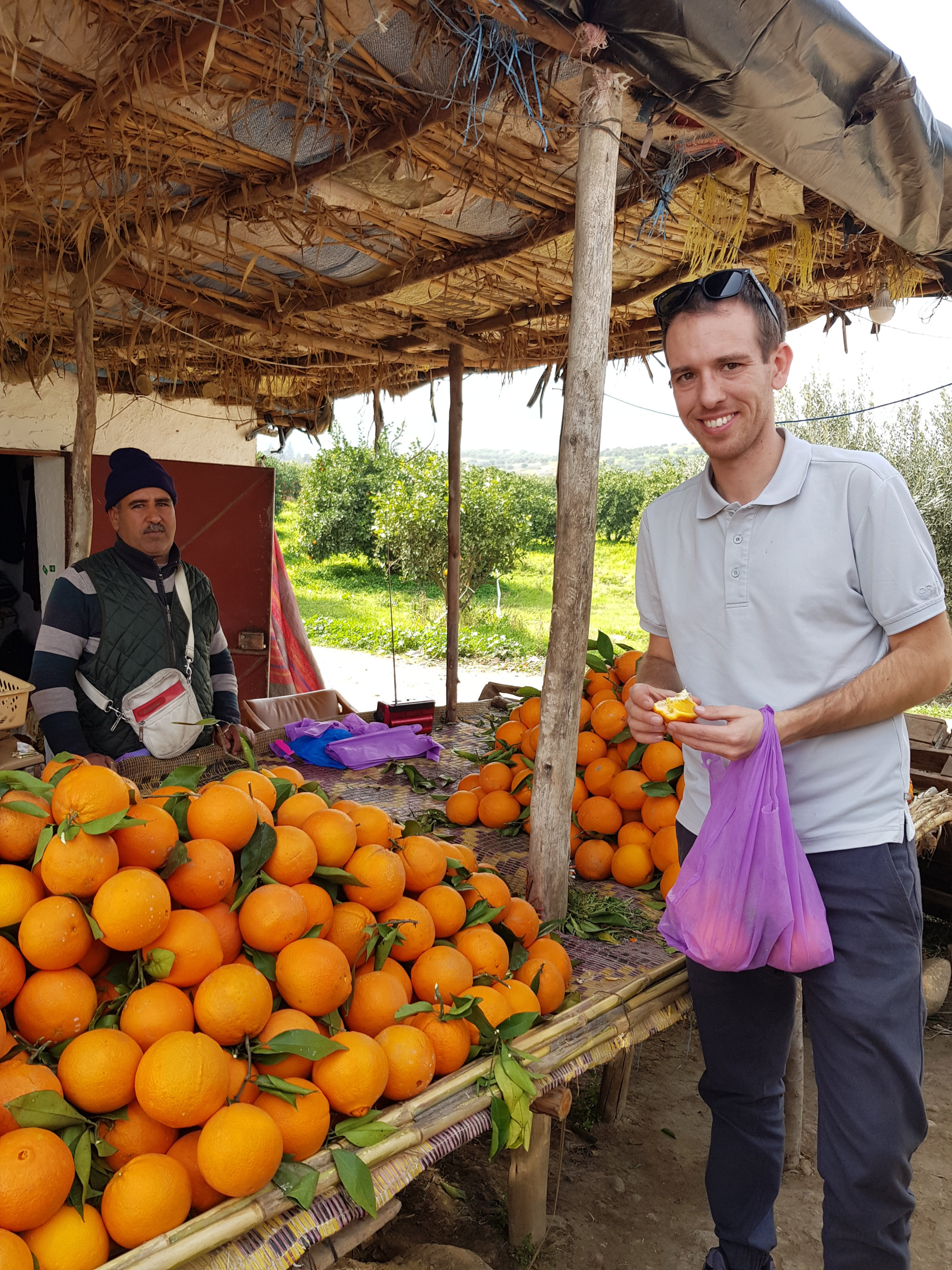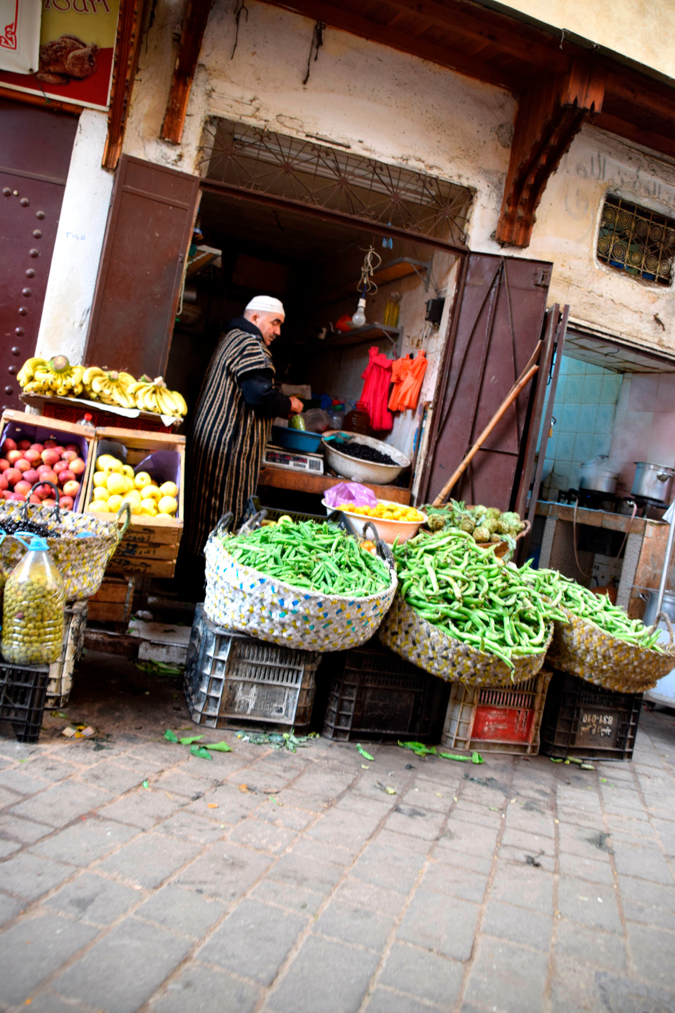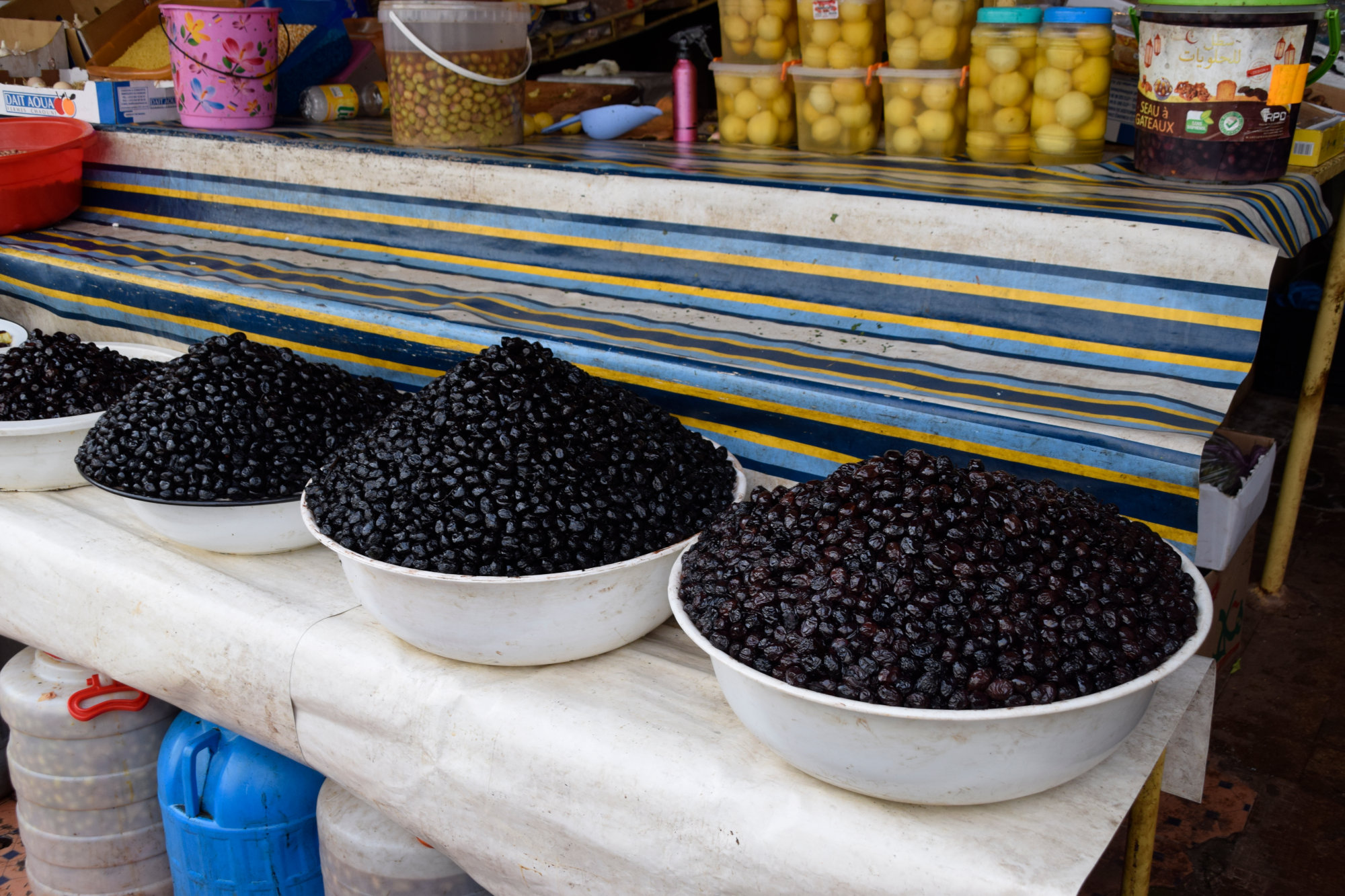 Auf dem Rückweg laufen wir schließlich noch durch den lokalen Souk von Fès, wo die örtliche Bevölkerung scheinbar ihre Einkäufe erledigt. Von überallher überwältigen einen Gerüche – ob von frischen Erdbeeren, eingelegten Oliven, oder aber vom abgehangenen Fleisch. Eine spannende Beobachtung ist dabei, dass der örtliche Metzger zur Gasse hin, sein Fleisch drapiert, während im Hintergrund noch die lebendigen Hühner gackern. Ein wenig makaber, aber irgendwie auch ehrlich.