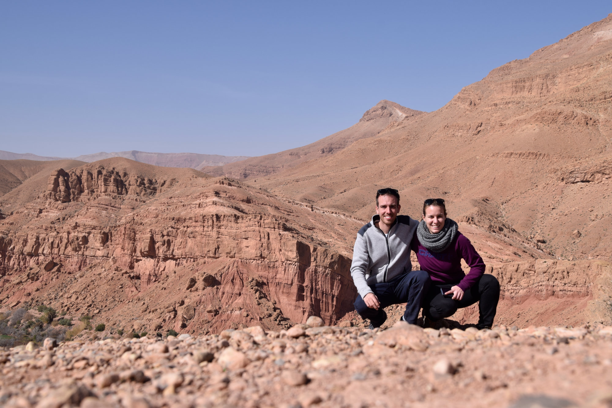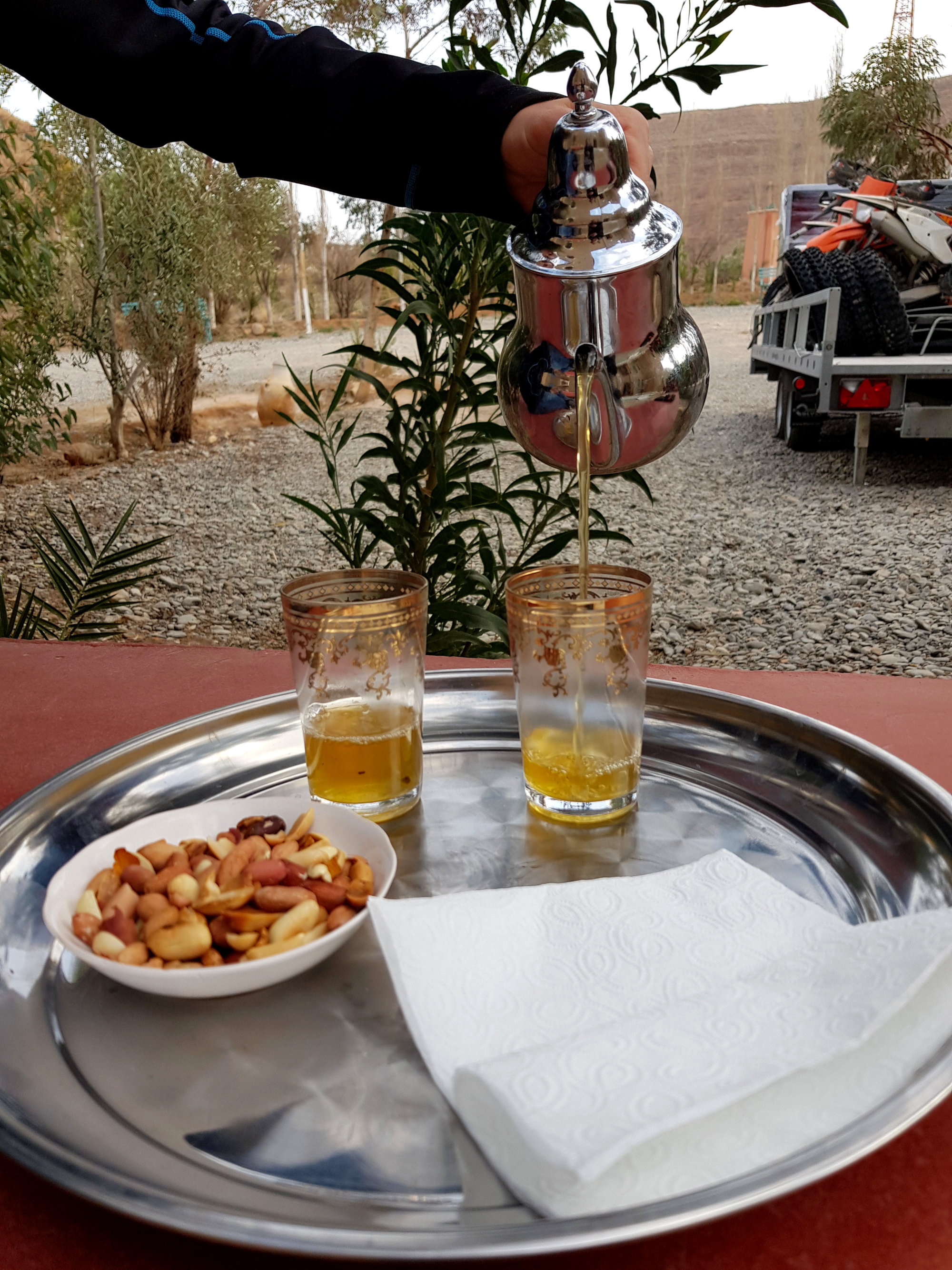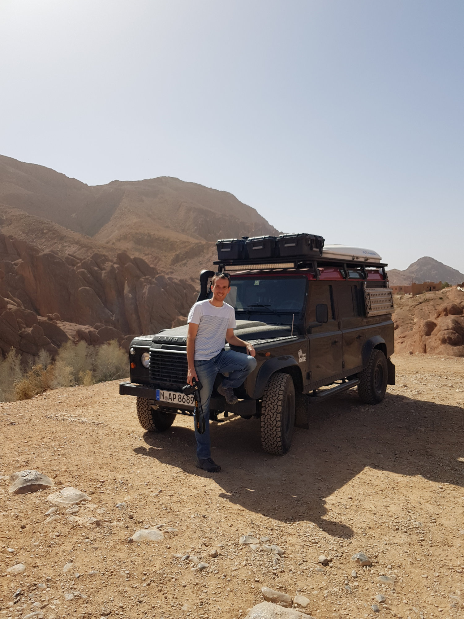 Am kommenden Morgen geht’s weiter Richtung Midelt, wo wir zu Mittag essen wollen. Der Magen knurrt, aber irgendwie finden wir außer Cafés einfach kein Restaurant, wo man mehr als ein Omelette zubereitet bekommt. Schließlich frage ich in einem Café, ob sie uns denn ein Restaurant empfehlen können. Und tatsächlich, versteckt in einem Hauseingang, in den wir nie reingegangen, geschweige denn ein Restaurant vermutet hätten, bekommen wir super leckere Tajines. Frisch gestärkt verlassen wir Midelt. An der nahegelegenen Tankstelle wird Max plötzlich von einem marokkanisch aussehenden Mann in perfektem Deutsch angesprochen. Es stellt sich heraus, dass Lahcen und seine Frau Anita hier in der Wüste regelmäßig Dünenfahrten anbieten (www.discoveraroundmorocco.com) und gerade von einer ihrer Touren zurückkehren. Spontan werden wir auf eine Tasse Kaffee eingeladen und freuen uns über die interessanten, interessierten und spannenden Gesprächspartner. Da wir allerdings noch etwas Weg vor uns haben, brechen wir schweren Herzens auf und düsen weiter Richtung Hohen Atlas. Das Camp für diesen Abend (Jourassique Camping) liegt dabei mitten in einer Schlucht und bietet eine traumhafte Kulisse. Der perfekte Platz, um hier unser Nachquartier aufzuschlagen.