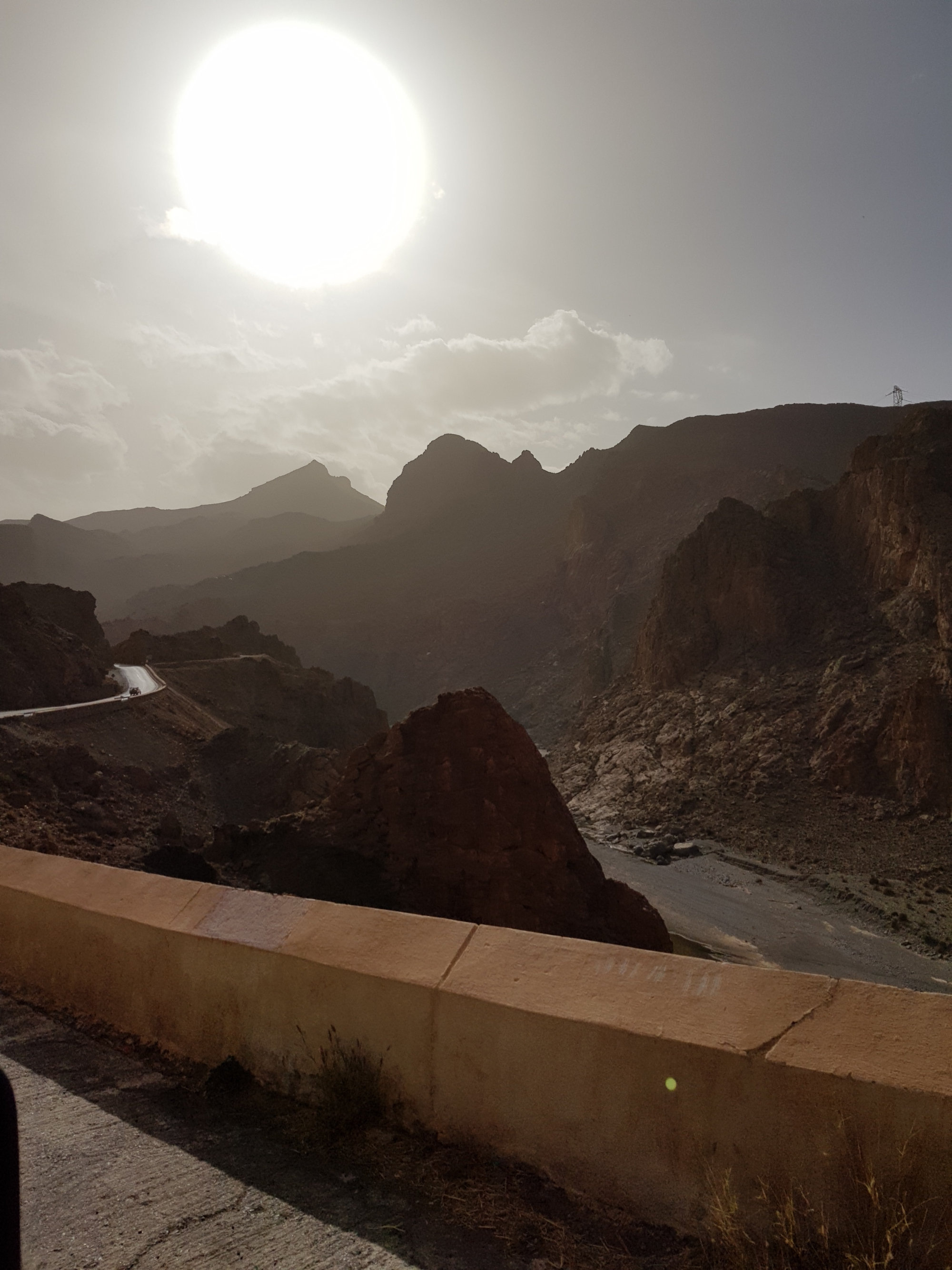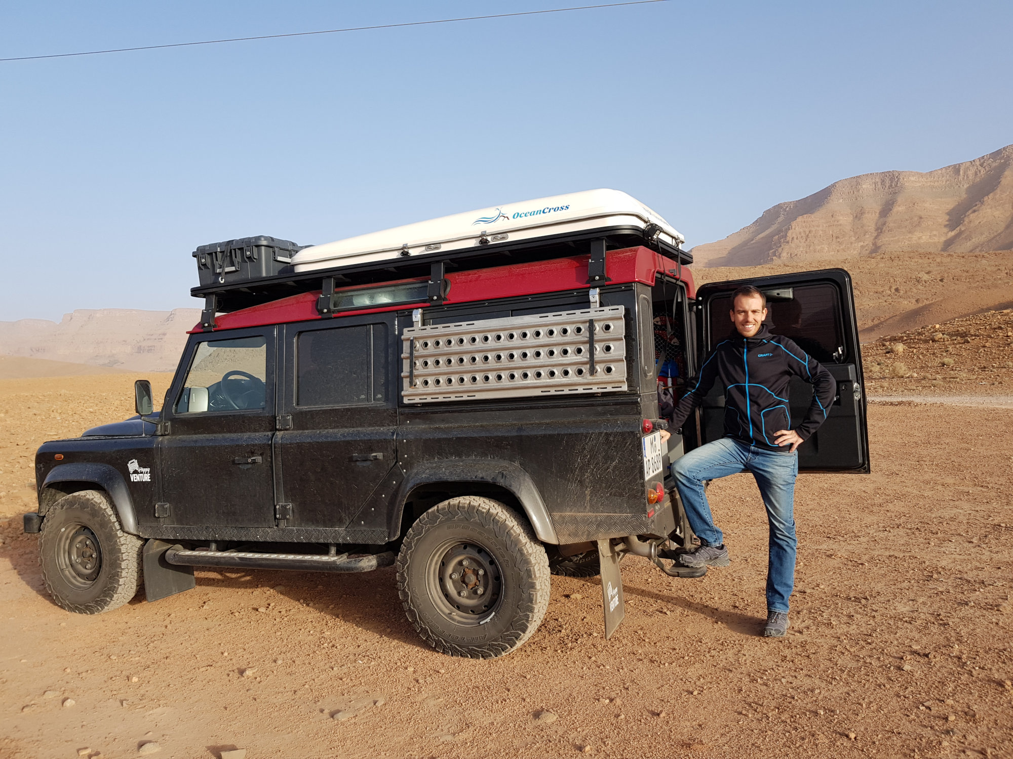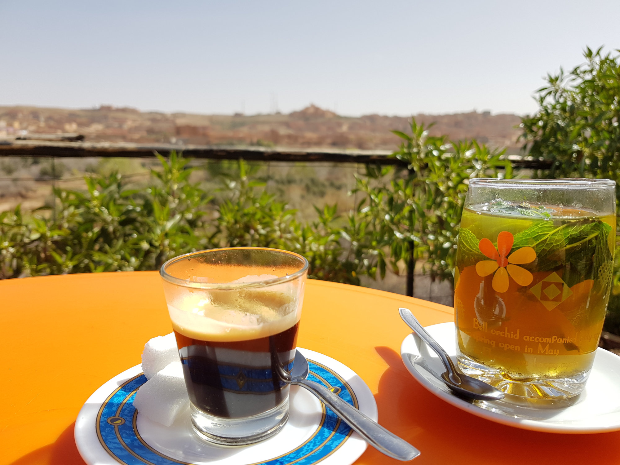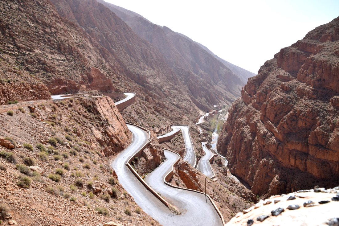 Am kommenden Morgen geht’s weiter Richtung Midelt, wo wir zu Mittag essen wollen. Der Magen knurrt, aber irgendwie finden wir außer Cafés einfach kein Restaurant, wo man mehr als ein Omelette zubereitet bekommt. Schließlich frage ich in einem Café, ob sie uns denn ein Restaurant empfehlen können. Und tatsächlich, versteckt in einem Hauseingang, in den wir nie reingegangen, geschweige denn ein Restaurant vermutet hätten, bekommen wir super leckere Tajines. Frisch gestärkt verlassen wir Midelt. An der nahegelegenen Tankstelle wird Max plötzlich von einem marokkanisch aussehenden Mann in perfektem Deutsch angesprochen. Es stellt sich heraus, dass Lahcen und seine Frau Anita hier in der Wüste regelmäßig Dünenfahrten anbieten (www.discoveraroundmorocco.com) und gerade von einer ihrer Touren zurückkehren. Spontan werden wir auf eine Tasse Kaffee eingeladen und freuen uns über die interessanten, interessierten und spannenden Gesprächspartner. Da wir allerdings noch etwas Weg vor uns haben, brechen wir schweren Herzens auf und düsen weiter Richtung Hohen Atlas. Das Camp für diesen Abend (Jourassique Camping) liegt dabei mitten in einer Schlucht und bietet eine traumhafte Kulisse. Der perfekte Platz, um hier unser Nachquartier aufzuschlagen.
