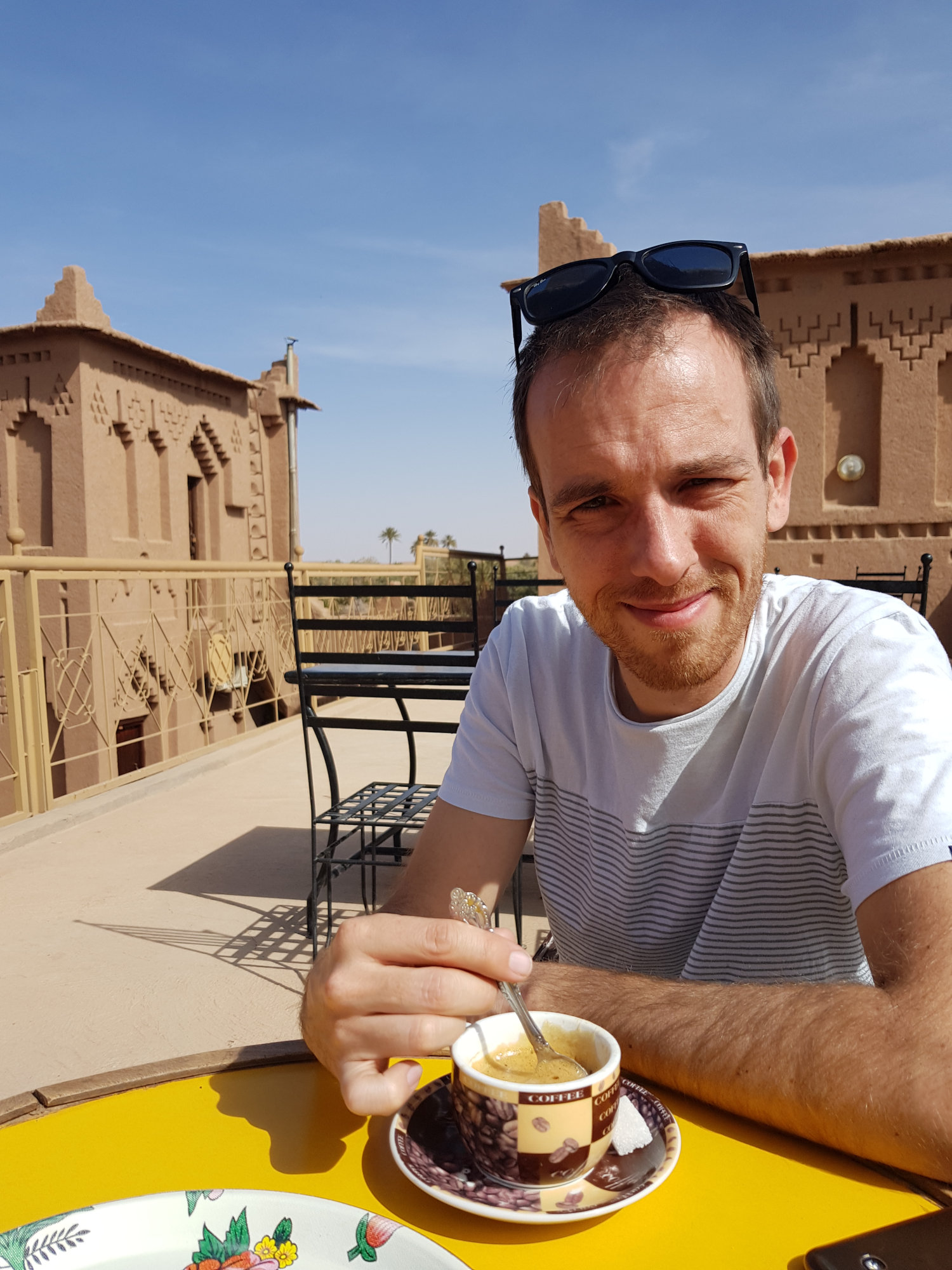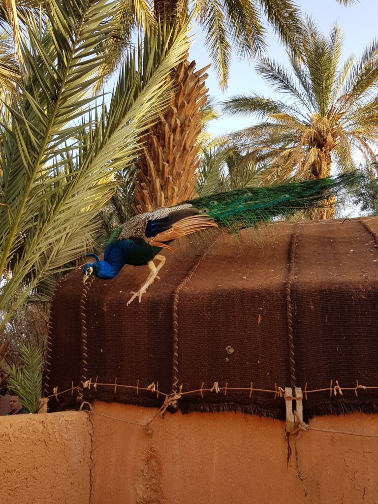 Während wir mittags uns in Skoura den Magen mit Bouchettes (Fleischspieße) und Ziegenkäse-Omelette vollschlagen, wird abends in Ouazazate am Campingplatz Ecolodge la Palmeraie selbst gekocht. Die Pfauen, die uns dabei immer wieder einen Besuch abstatten, sind dabei nicht die einzigen seltsamen Vögel auf dem Campingplatz…