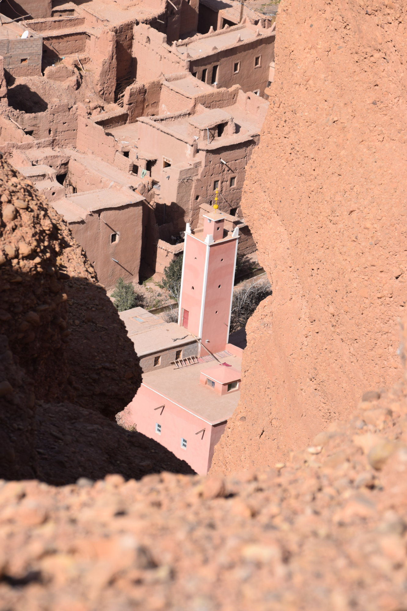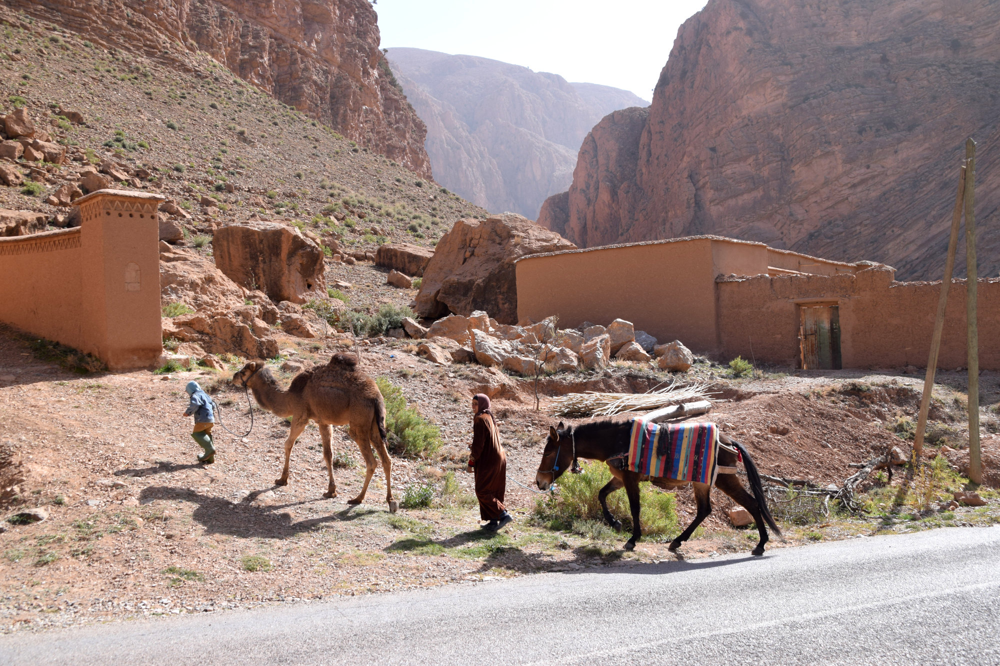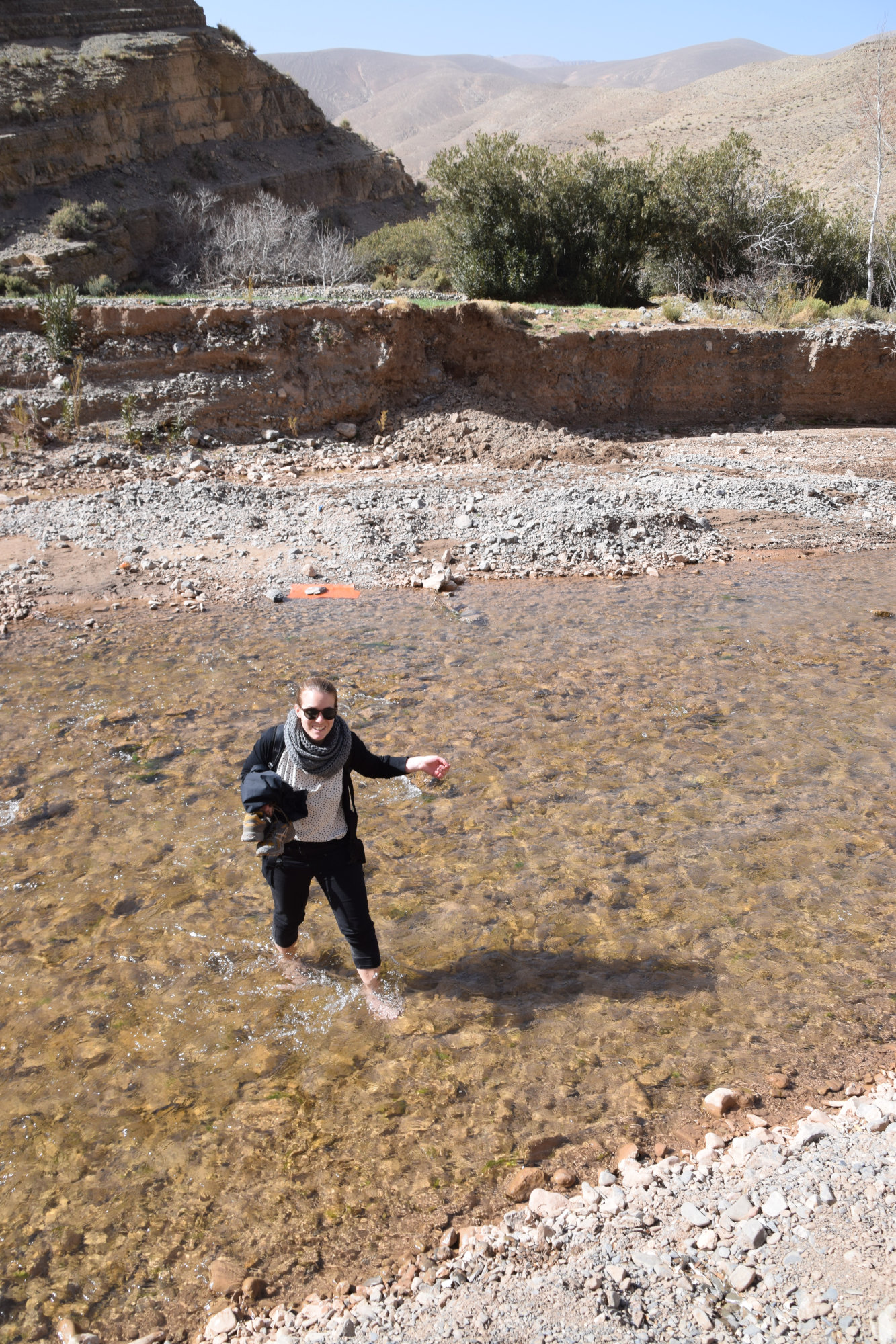 Doch zuvor geht’s tief hinein in die Dadesschlucht – die über kurvenreiche Straßen zu erreichen ist und mit beeindruckender Landschaft glänzt. Am Camping Platz angekommen (Camping Berber de la Montagne), machen wir noch einen kleinen Spaziergang entlang der Schlucht und einen Abstecher durch ein Berber-Dorf. Leider müssen wir auf dem Rückweg (nachdem wir den Fluss über eine nicht gerade vertrauenswürdig aussehende Brücke gequert hatten) feststellen, dass es in Nähe des Camps keine zweite Brücke gibt. Also Schuhe aus und einmal quer durch den eisigen Bergfluss gewatet – marokkanisches Kneip-Becken Deluxe.