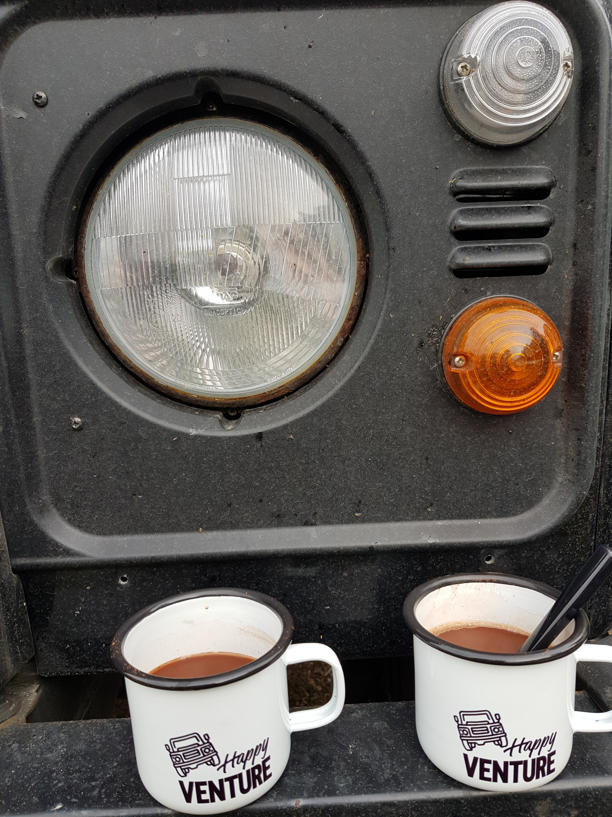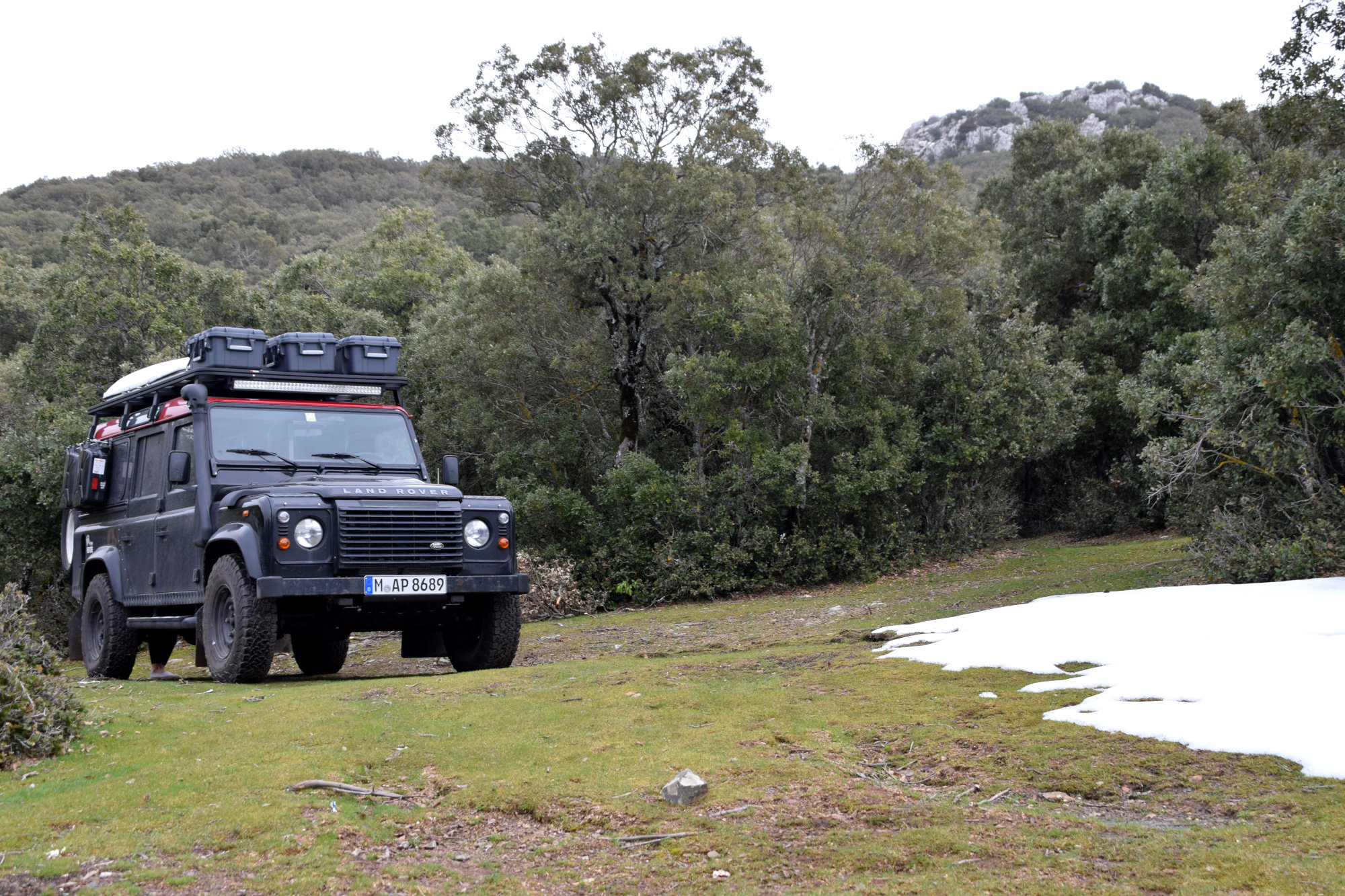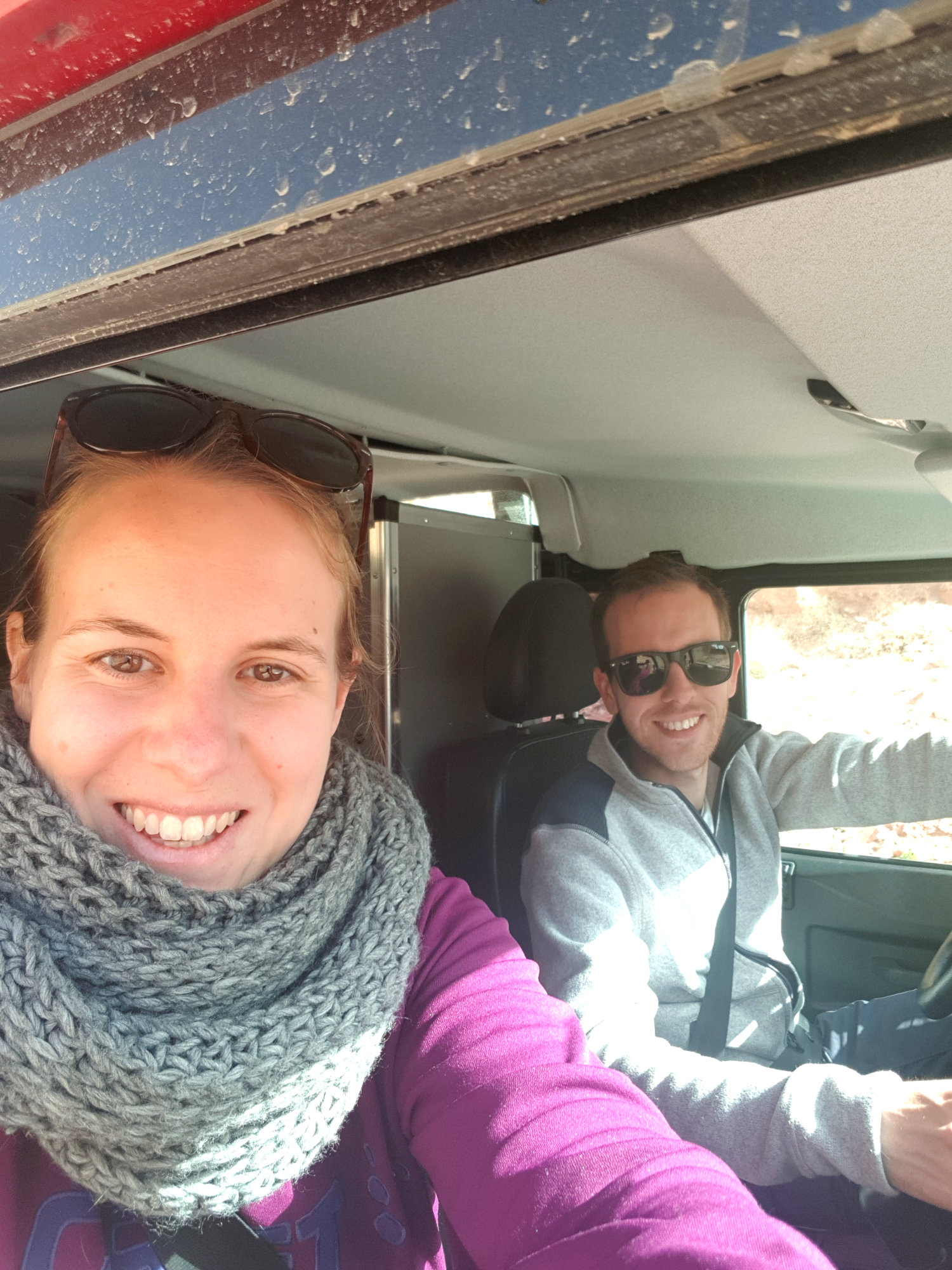 Danach kringeln wir uns schnell in unsere Schlafsäcke ein und versuchen zu schlafen. Allerdings stellt sich das als gar nicht so einfach raus, da man die Wahl zwischen Gefrierbrand im Gesicht und Ersticken im Schlafsack hat. Sobald man nur ein klein bisschen aus dem Schlafsack rauslurt, ist schon die Nase eingefroren. Als wir am nächsten Morgen ziemlich zerknittert und fröstelnd aus dem Dachzelt kriechen ist die Frontscheibe von Rotkäppchen gefroren und am Landy haben sich erste Eiszapfen gebildet. Wir packen so schnell es geht unsere Sachen zusammen und düsen los, um mittels Heizung auf Hochtouren wieder etwas Wärme in den Körper zu bekommen. Als die Sonne langsam rauskommt, suchen wir uns einen schönen Picknick-Platz um Kaffee & Oat zu kochen. Eine Wohltat!