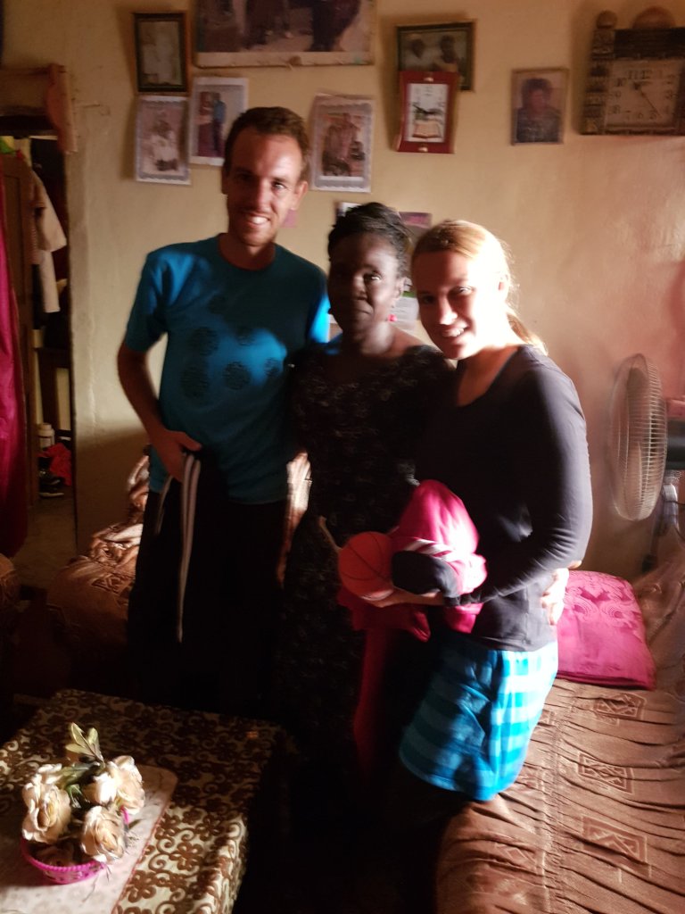 Auch Mary und der Pastor sind da und freuen sich riesig über unsere Spende für das Waisenprojekt (Fußballtrainingsanzüge und zwei Fußbälle).