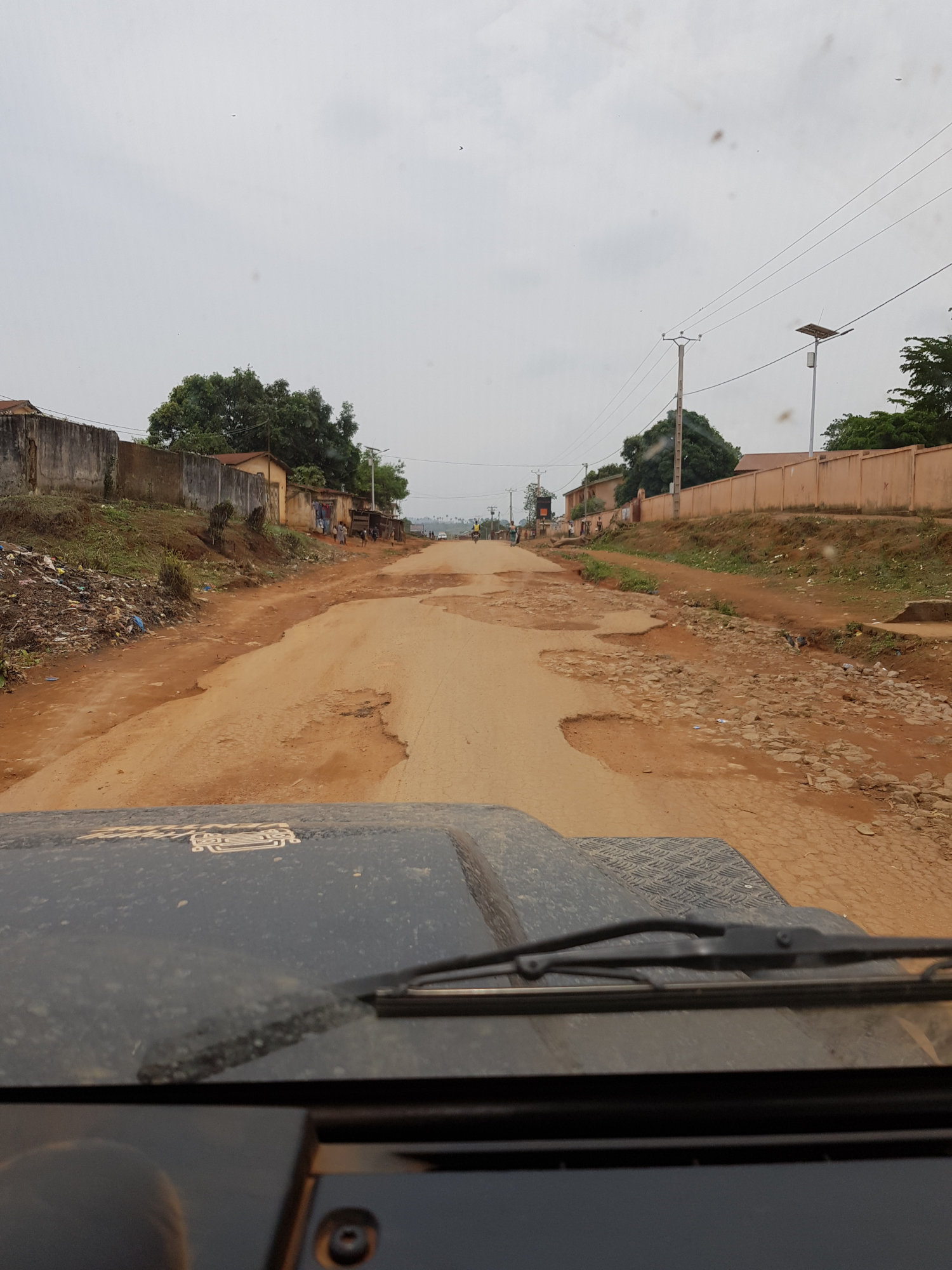 Nach erfolgreicher Flussüberquerung fahren wir auf quälend schlechten Straßen weiter. Immer wieder werden wir angehalten von schwer bewaffneten Militärkontrollen. Gegen Mittag treffen wir im Ort Gueckedou ein – einer trubeligen und etwas verdreckten Stadt, wo wir allerdings ein nettes Lokal finden. Nach einem großen Omelette mit Mayo und Baguette, kaufen wir noch ein paar Vorräte ein und besorgen uns eine Plastikplane. Diese soll uns bestenfalls beim nächsten nächtlichen Regen das eindrigende Wasser vom Hals halten.