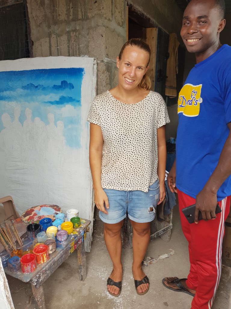 Wir laufen ein paar Minuten hinter ihm her durch die sehr ordentlich wirkenden Slumgassen Teshies um schließlich bei seinem „Atelier“ anzukommen. Dort dürfen wir seine letzten Werke bewundern und geben ein Gemälde von Rotkäppchen zusammen mit uns in Auftrag – mit der Ungewissheit, ob es ein Gemälde wird, das im Wohnzimmer oder doch eher im Keller zukünftig seinen Platz finden wird.