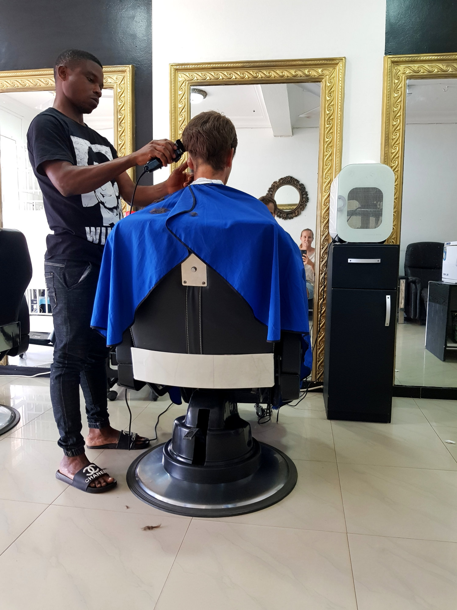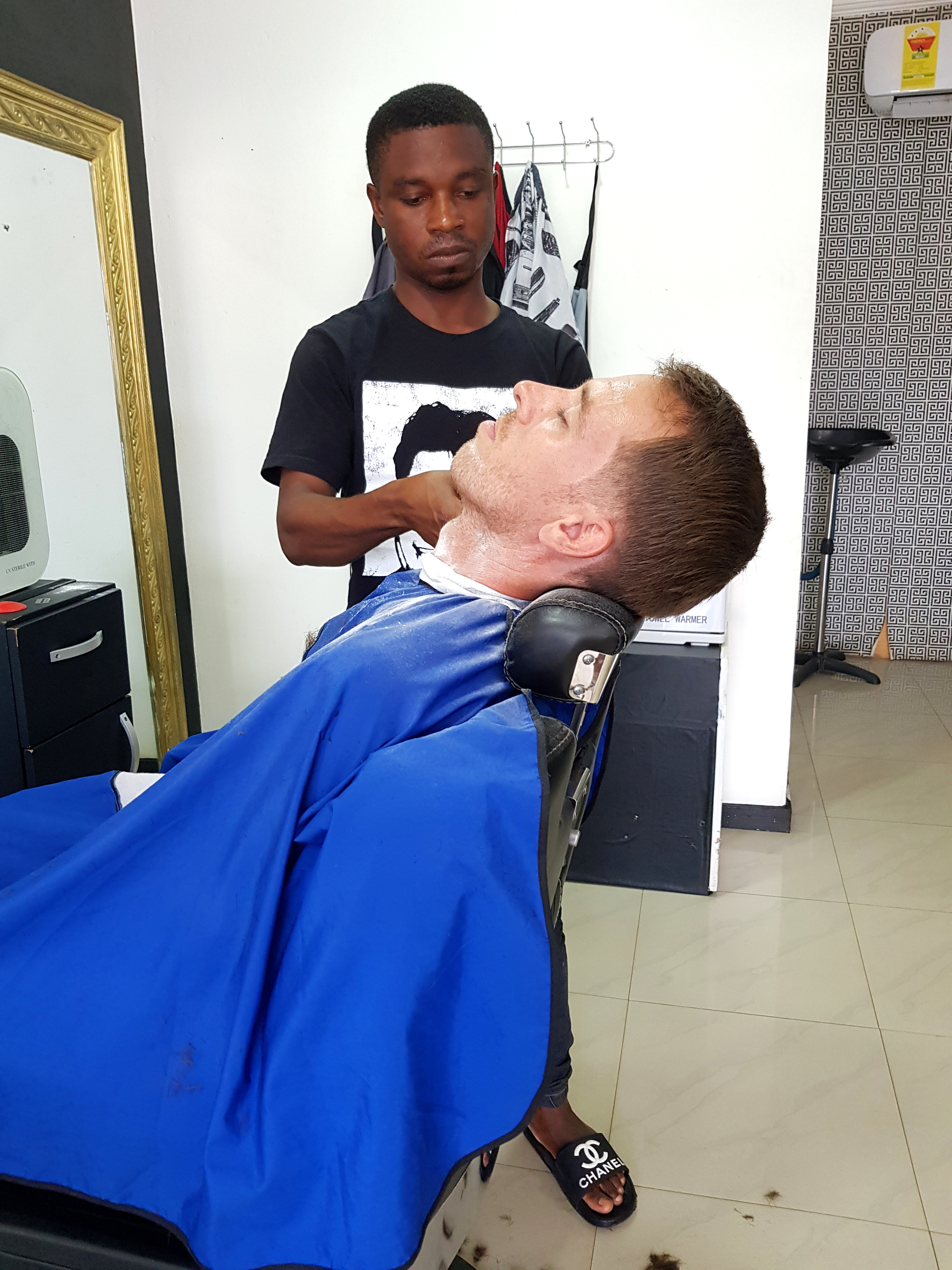 Auf der Fahrt Richtung Lake Volta machen wir noch einen kurzen Stop, um Rotkäppchen ordentlich reinigen zu lassen. Dabei entdecken wir neben der Waschstation auch einen Friseur. Da sowieso 30 Minuten totgeschlagen werden müssen, nutzt Max die Zeit, um sich zwischenzeitlich seiner lang gewordenen Haare zu entledigen. Nachdem ihm im ersten Schritt vom Chanel-Adiletten tragenden Friseur ein Topfschnitt verpasst wird, greife ich ein und bestehe darauf, dass die Haare kürzer geschnitten werden. Haarschnitt #2 kann sich sehen lassen und weil’s gerade passt, macht sich der Friseur auch gleich über Max‘ Bart her. Dabei wird er zuerst mit einer dicken Schicht Babypuder eingerieben und dann unter anderem mit einer frischen Rasierklinge von den Barthaaren befreit. Leider sehe ich erst zu spät als Max dem fleißigen Friseur die vereinbarten 3 Euro in die Hand drückt, dass er ihm einen Oberlippenbart hat stehen lassen. Scheints ist das sein Bild eines gepflegten Weißen. Ich finde den Anblick schrecklich, muss aber gut eine Woche warten, bis Max sich schließlich meiner erbarmt und das Hitler-Bärtchen abrasiert.