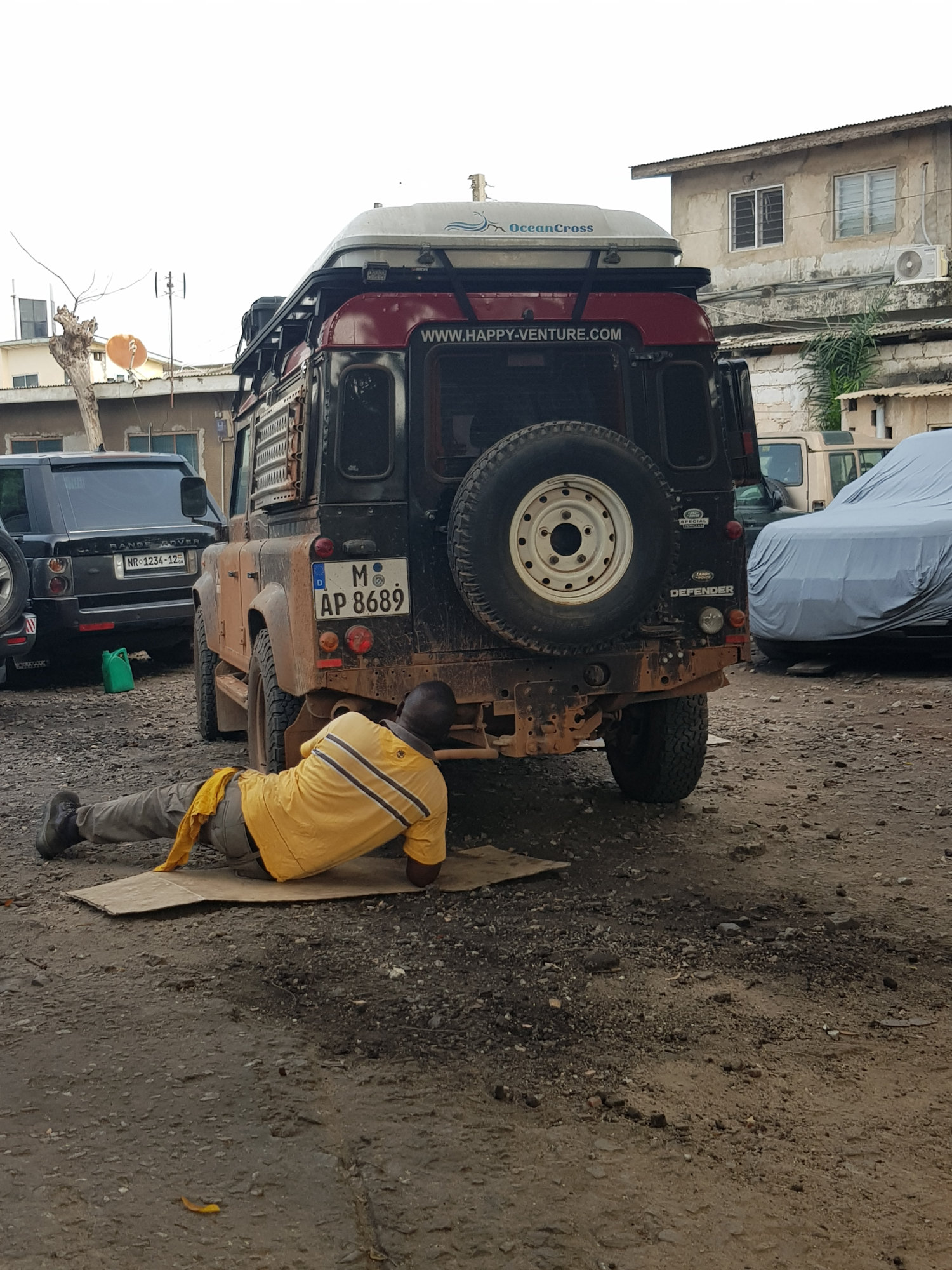 Frustriert machen wir uns zu einer Autoversicherung in Accra auf, um dort eine Versicherungskarte für Zentralafrika zu erhalten (carte rose). Die in Senegal erworbene Versicherung für die westafrikanischen Länder bis einschließlich Benin (carte brune) hatte uns gute Dienste erwiesen und nervige Diskussionen mit Grenzbeamten und Polizeikontrollen über unsere in Deutschland abgeschlossene Afrika-Versicherung erspart. Doch die hiesige AXA-Versicherung kann uns nicht weiterhelfen. Somit kehren wir unverrichteter Dinge wieder zu unserem Automechaniker zurück. Dieser erklärt, dass Rotkäppchen fit sei und er nichts gefunden hätte. Das Schalt-Geräusch könne er sich nicht erklären, allerdings dürfte es nicht weiter schlimm sein. Sein noch hinzugefügter Beisatz