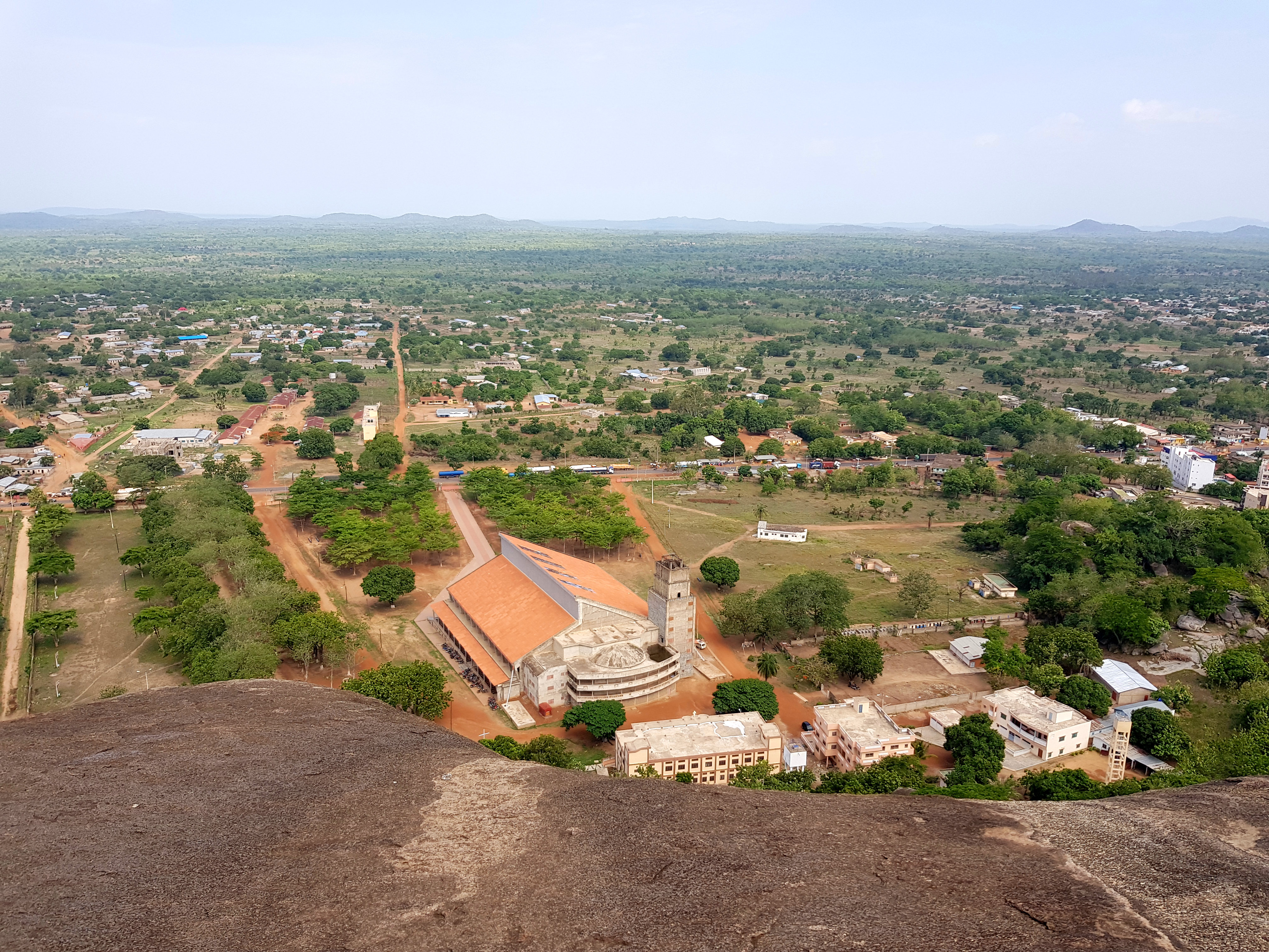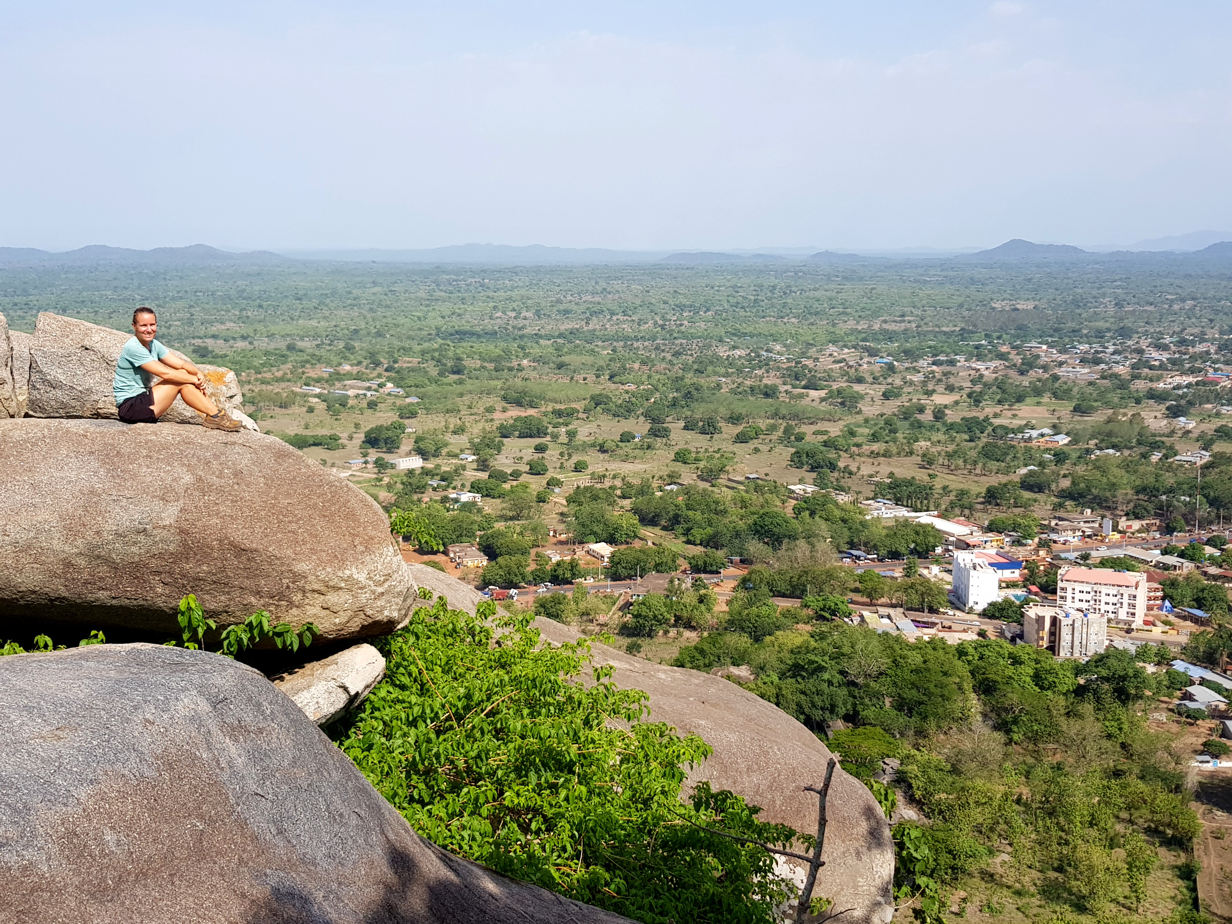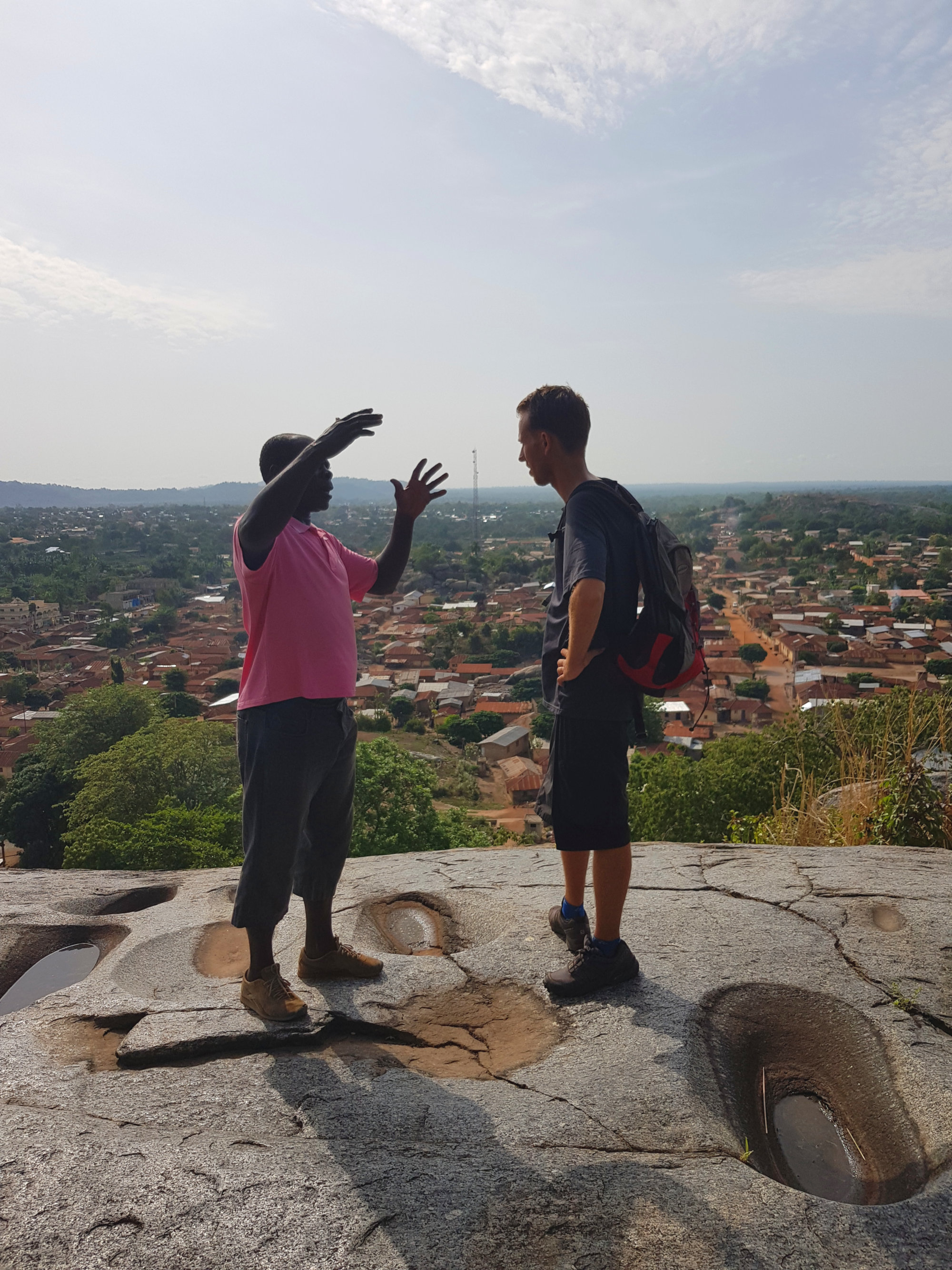 Da in der Gegend rund um Dassa-Zoumé wunderschöne Hügel zum Wandern einladen, beschließen wir trotz Nigeria-Visa-Stress uns einen lokalen Guide zu nehmen, um ein wenig mehr von der Landschaft Benins zu sehen und dabei den Kopf frei zu bekommen. Unser Wanderführer nimmt uns auf dem Gepäckträger seines Mopeds mit und wir rasen zu Dritt ziemlich waghalsig durch die schlaglöcherdurchsetzten Straßen um am Fuße einer der Hügel anzuhalten. Von hier aus beginnt bei knapp 40 Grad im Schatten der schweißtreibende Aufstieg eines der höchsten Hügel der Gegend. Dabei kommen wir an einer hoch über der Stadt gelegenen Opferstätte vorbei, wo laut unserem Guide regelmäßig eine Art Voodoo-Gottestdienst bzw. Opferungen abgehalten werden. Die leeren Gefäße, Tücher und Gruben rund um die Bäume bestätigen seine Aussage.