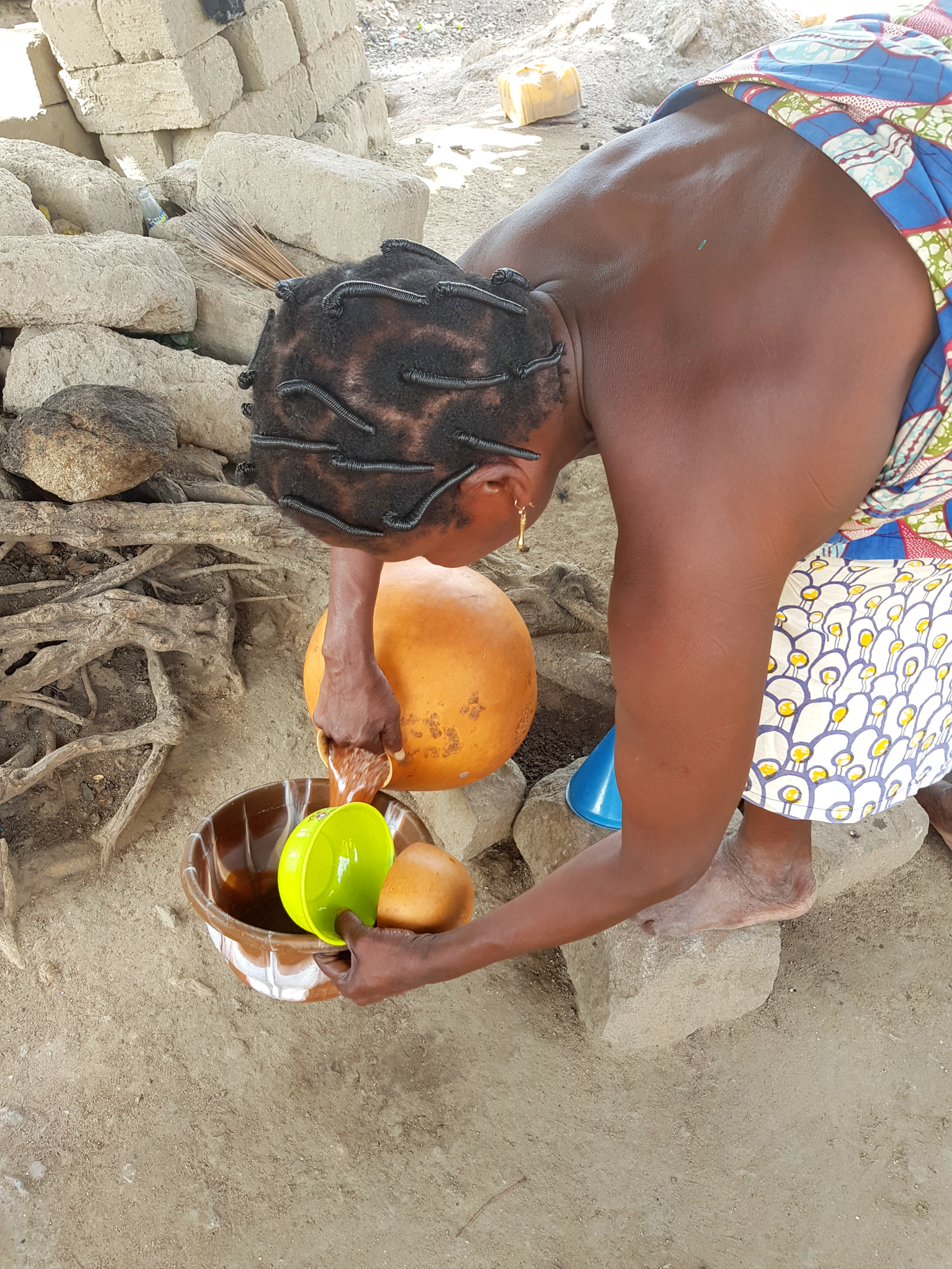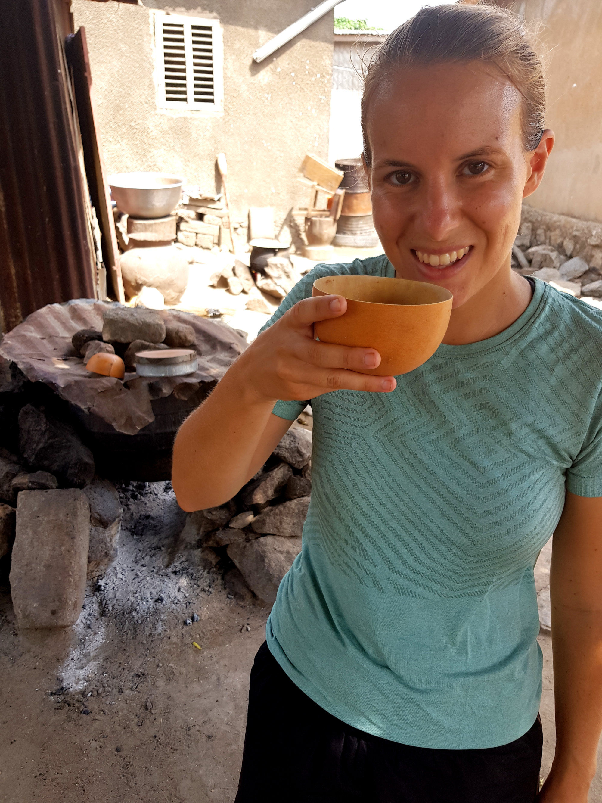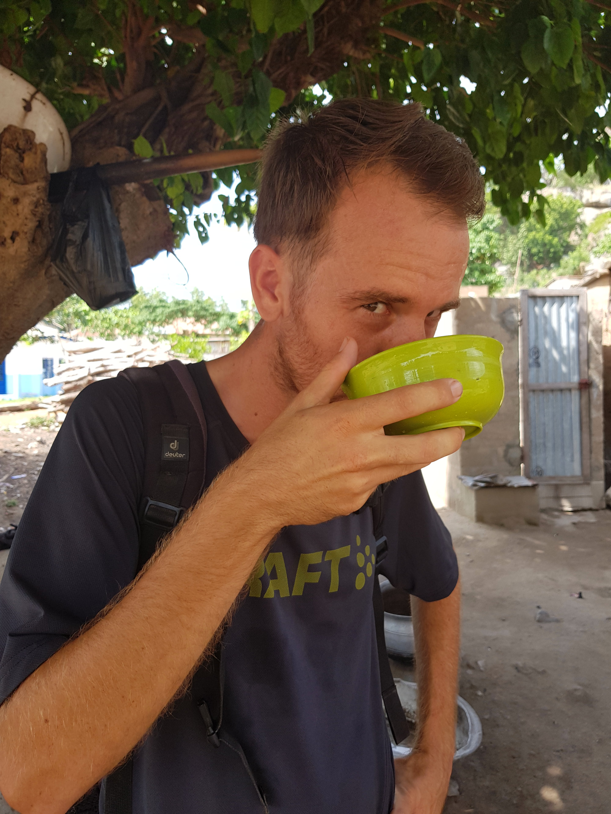Als wir uns wieder auf das Moped schwingen wollen, sehen wir eine Frau emsig in einem dicken Bottich rühren. Wir fragen unseren Guide, was denn hier produziert würde, und ehe wir uns wehren können, werden uns große Schalen mit Sorghum Bier gereicht. Dabei handelt es sich um Bier, das aus vergorener Hirse hergestellt wird und einen für unsere Münder doch sehr gewöhnungsbedürftigen Geschmack hat. Doch es hilft nichts – aus Respekt vor der Sorghum-Köchin, zwingen wir uns mit einem Lächeln das Gesöff die Kehle runter. Vielleicht ist ja auch die anstehende, rasante Motorrad-Fahrt mit etwas Alkohol im Blut besser zu ertragen?