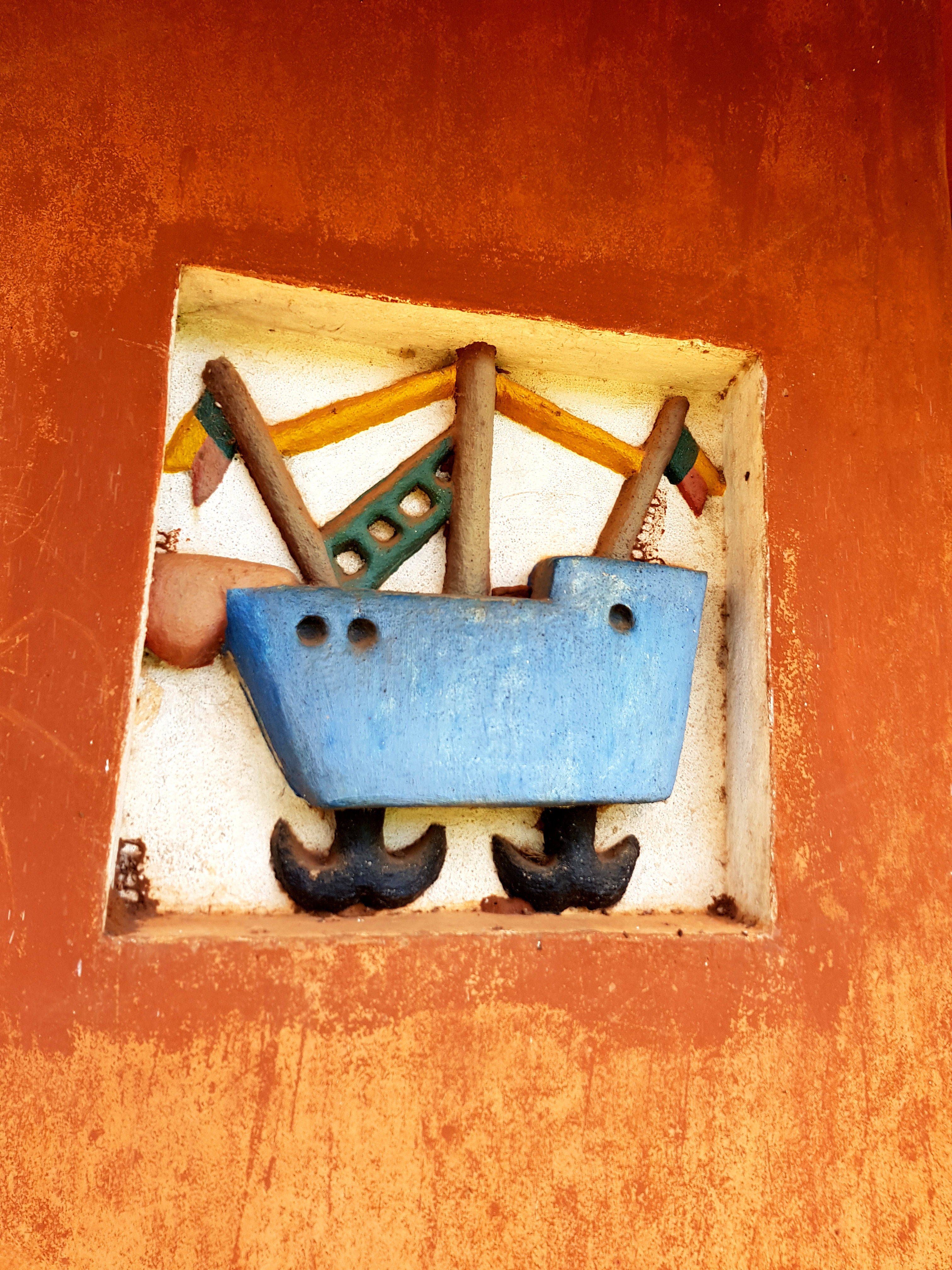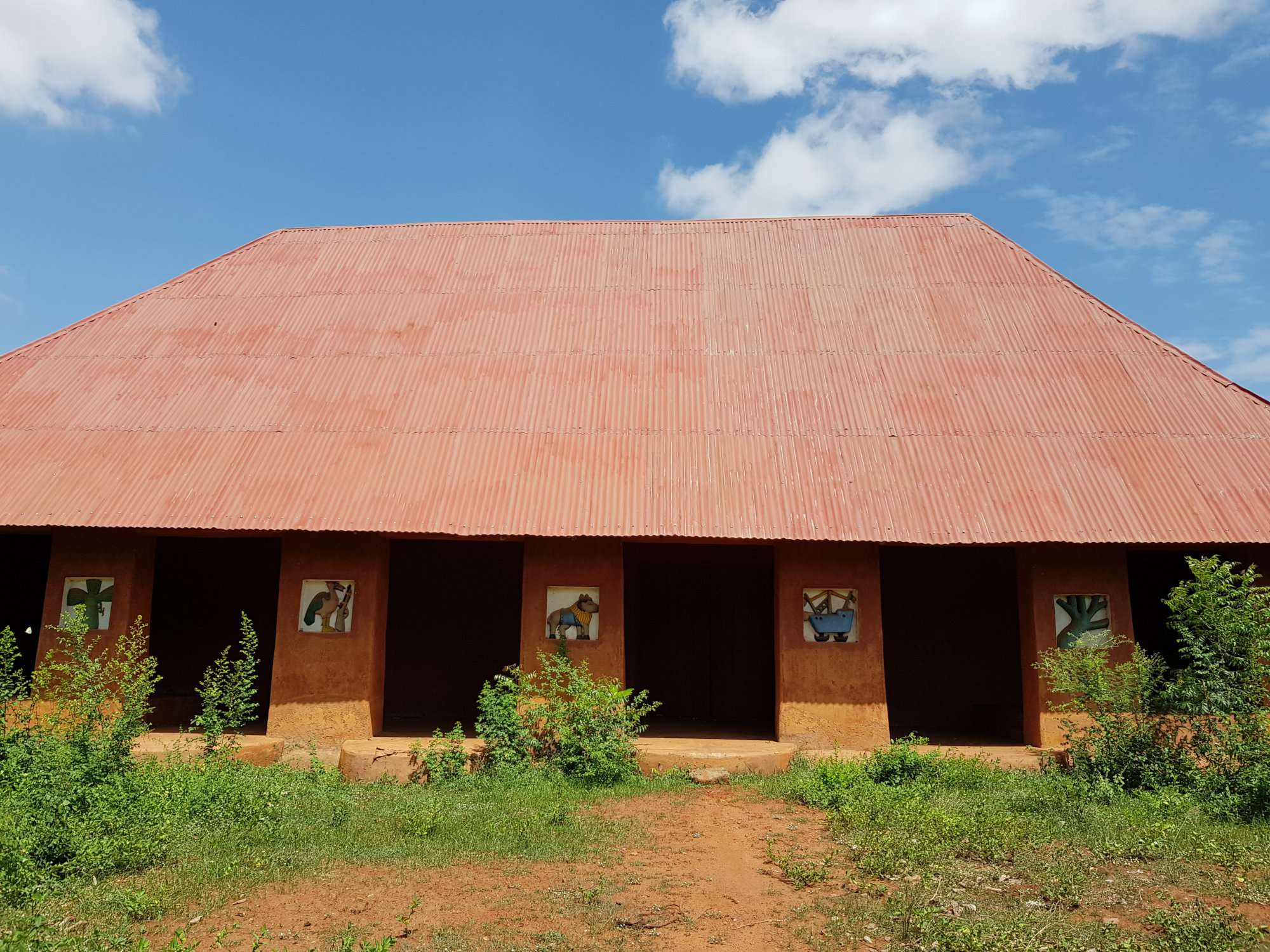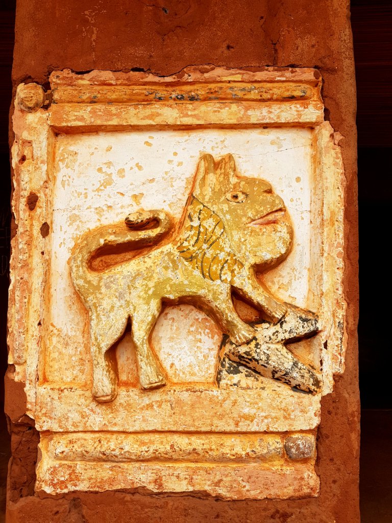 Noch im Pfannkuchen-Himmel schwelgend machen wir uns schließlich zum eigentlichen Ziel unseres Abomey Aufenthaltes auf: Die Besichtigung einer der vielen Königspaläste. Dazu muss man wissen, dass Abomey Hochburg des Fon-Volkes war und von Mitte des 17. Jhd. bis Ende des 19. Jhd. als Regierungsstätte für sämtliche Könige des Dahomey Königtums diente. Da jeder König einen eigenen Palast für seine Regierungszeit bekam, findet man hier entsprechend viele mehr oder weniger gut erhaltene Relikte aus dieser Zeit. Auf dem Weg zum Museum, das neben einem Königspalast auch zahlreiche Ausstellungsstücke aus der Königszeit beinhaltet, passieren wir bereits diverse aus Lehm gefertigte Mauern, in die kunstvoll Machtsymbole und Zeichen für den jeweiligen Regierenden eingearbeitet sind.
