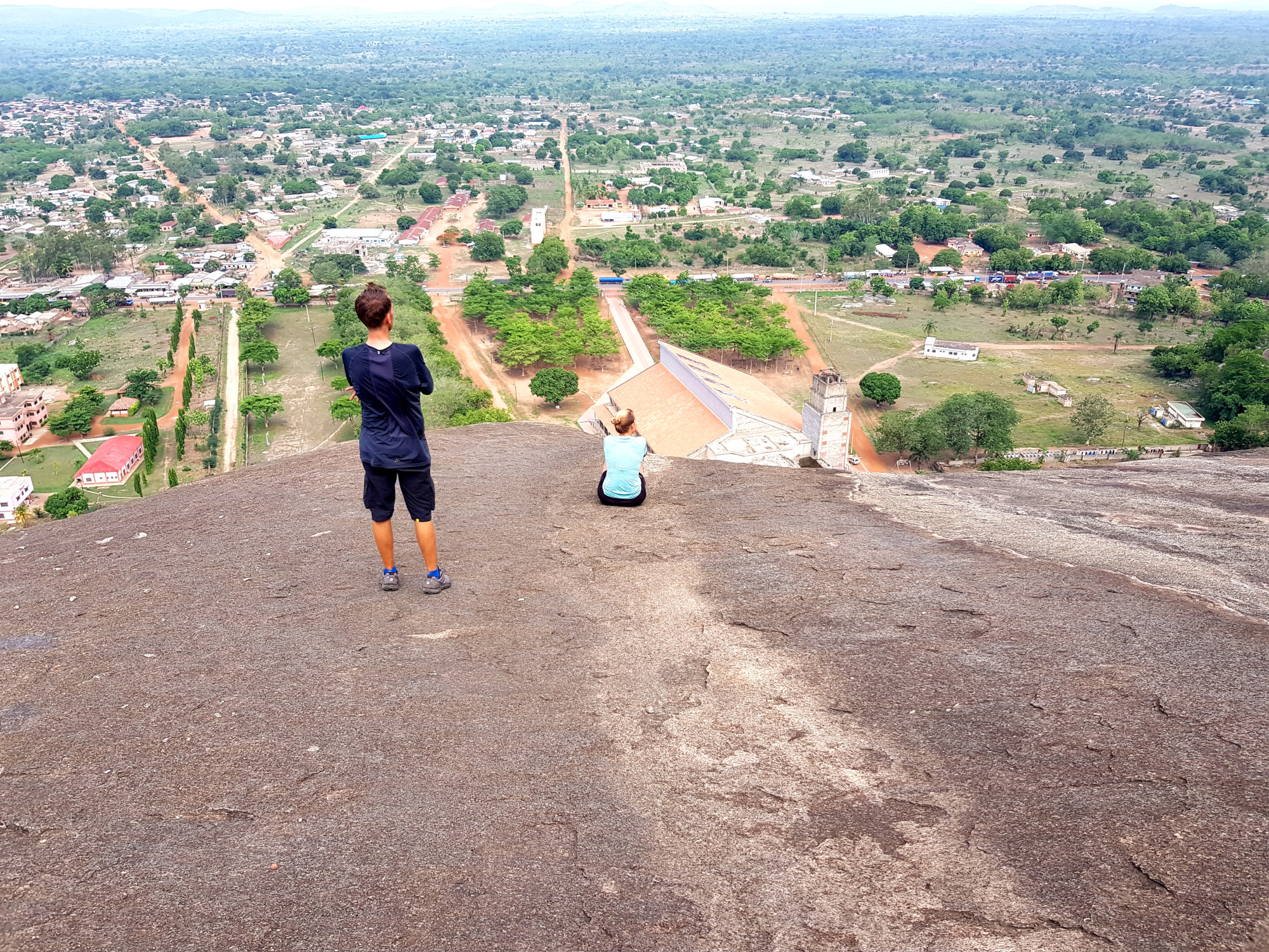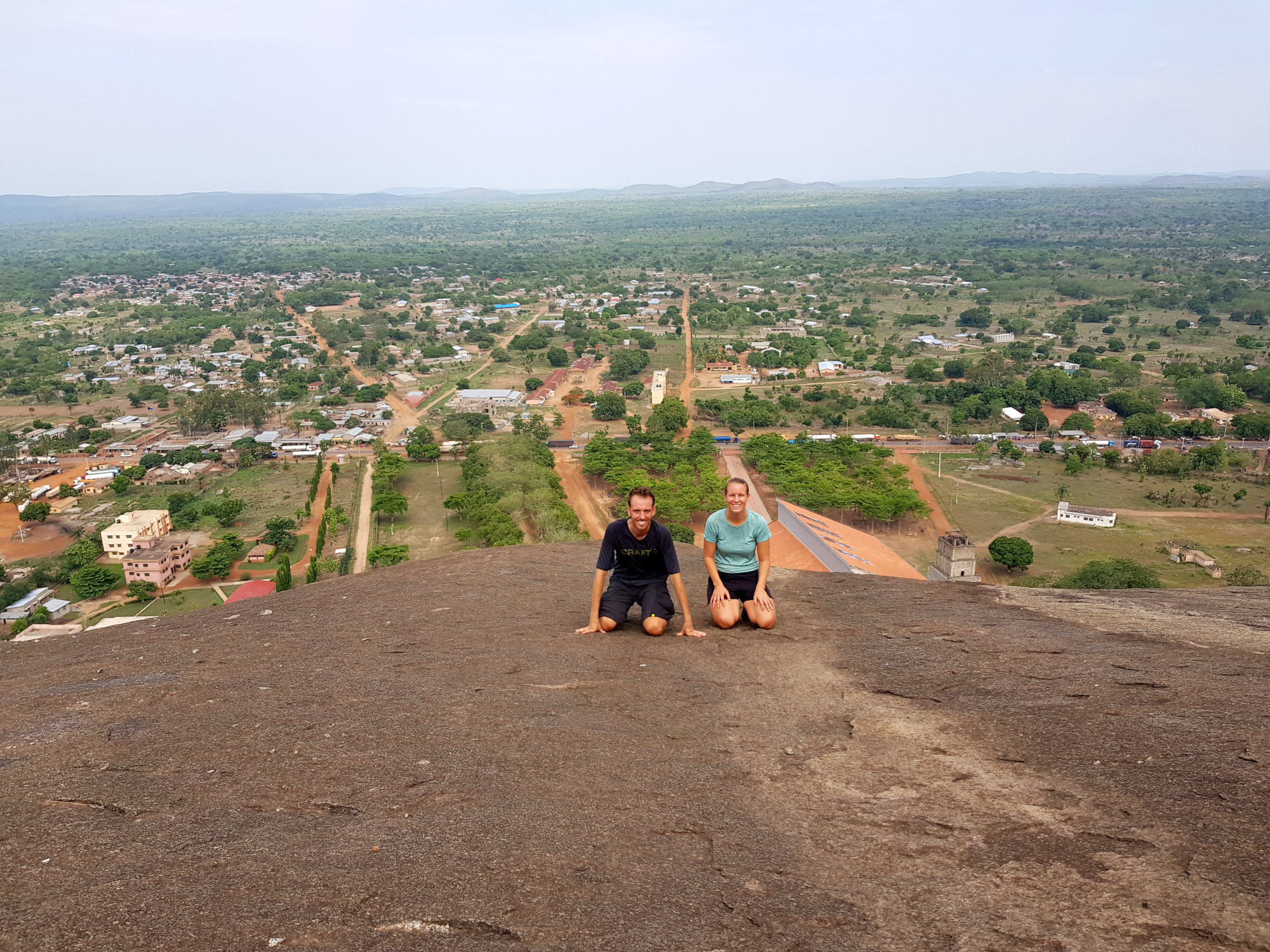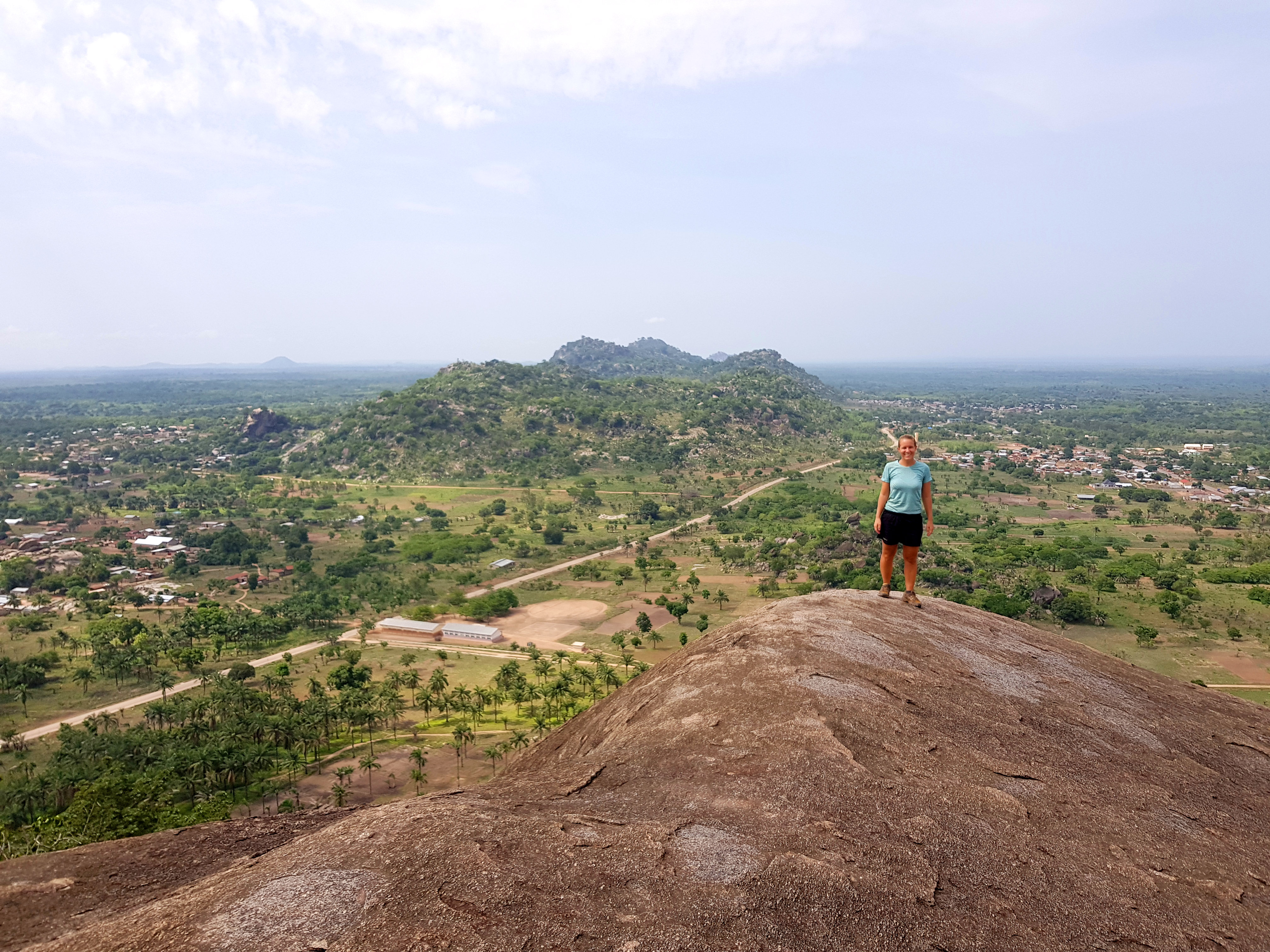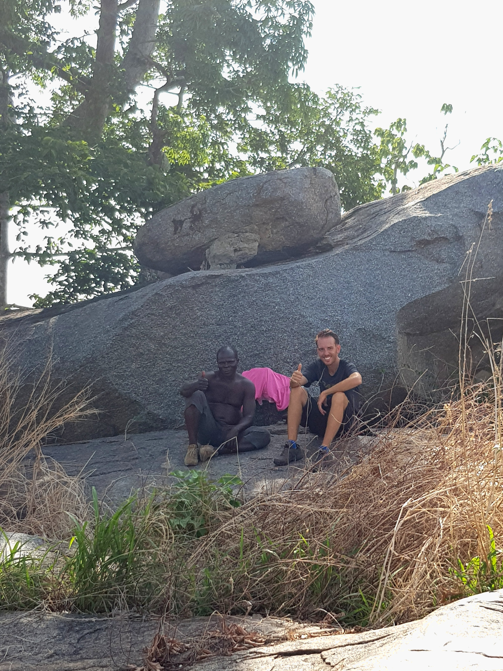 Da in der Gegend rund um Dassa-Zoumé wunderschöne Hügel zum Wandern einladen, beschließen wir trotz Nigeria-Visa-Stress uns einen lokalen Guide zu nehmen, um ein wenig mehr von der Landschaft Benins zu sehen und dabei den Kopf frei zu bekommen. Unser Wanderführer nimmt uns auf dem Gepäckträger seines Mopeds mit und wir rasen zu Dritt ziemlich waghalsig durch die schlaglöcherdurchsetzten Straßen um am Fuße einer der Hügel anzuhalten. Von hier aus beginnt bei knapp 40 Grad im Schatten der schweißtreibende Aufstieg eines der höchsten Hügel der Gegend. Dabei kommen wir an einer hoch über der Stadt gelegenen Opferstätte vorbei, wo laut unserem Guide regelmäßig eine Art Voodoo-Gottestdienst bzw. Opferungen abgehalten werden. Die leeren Gefäße, Tücher und Gruben rund um die Bäume bestätigen seine Aussage.