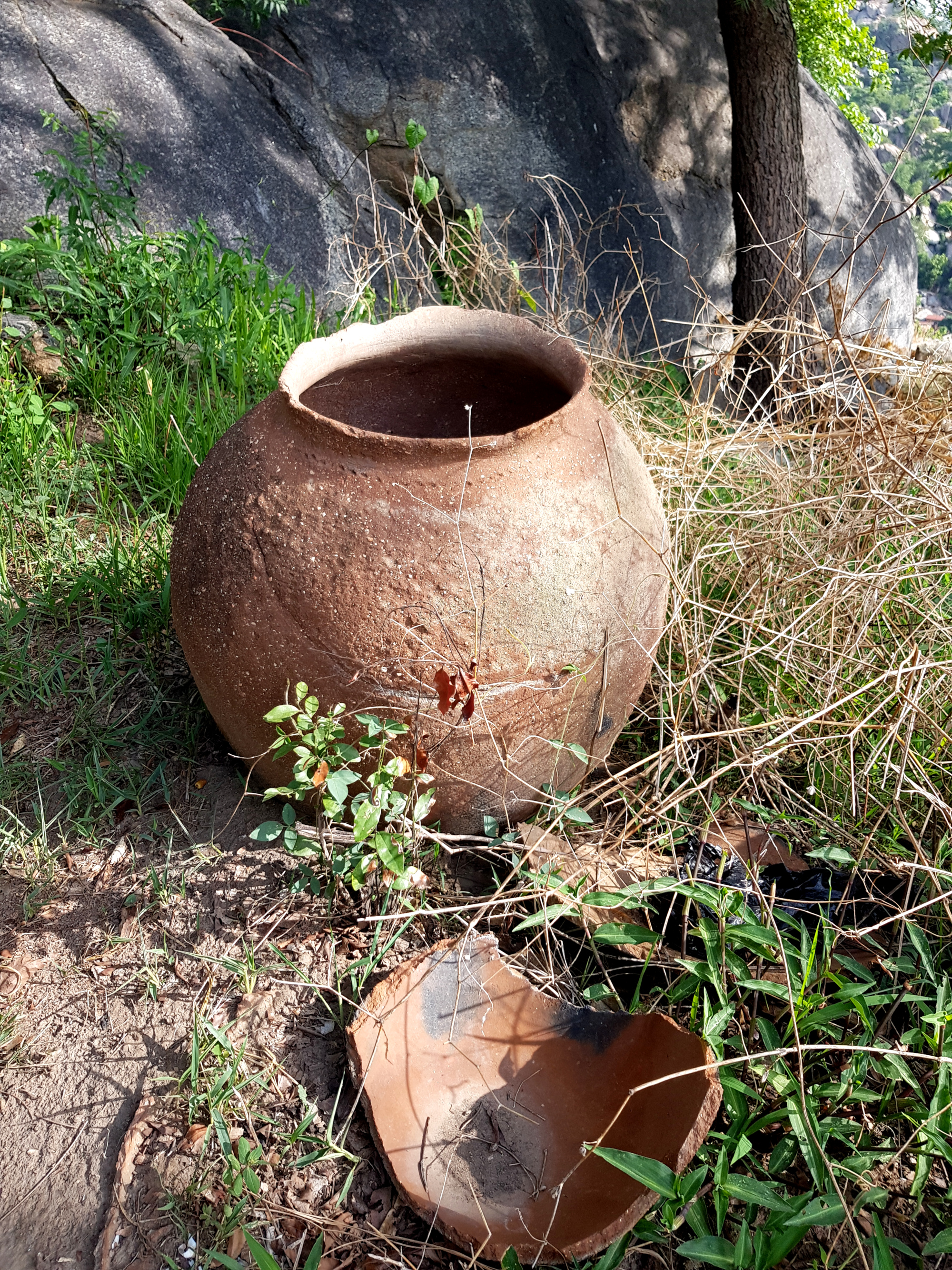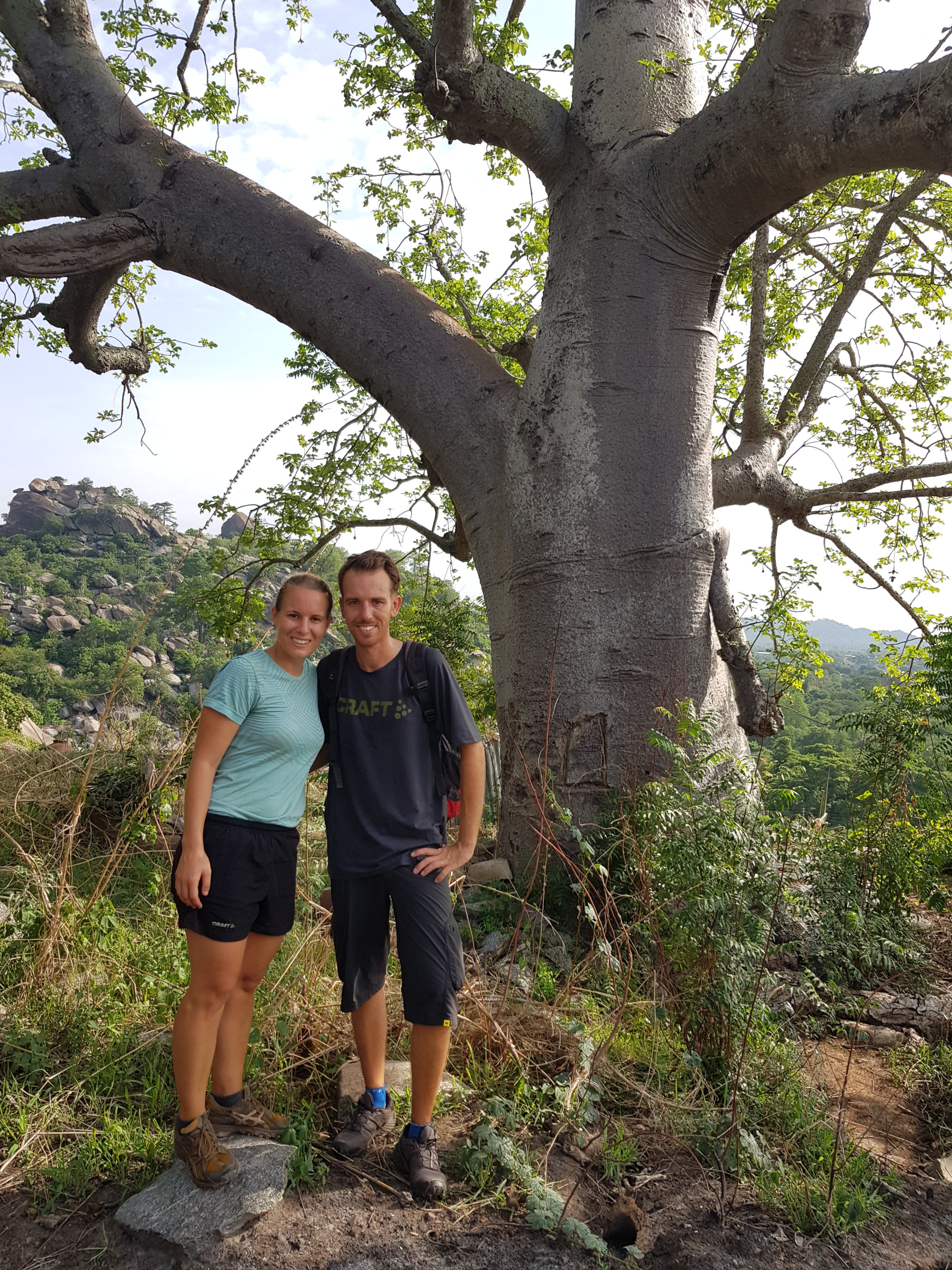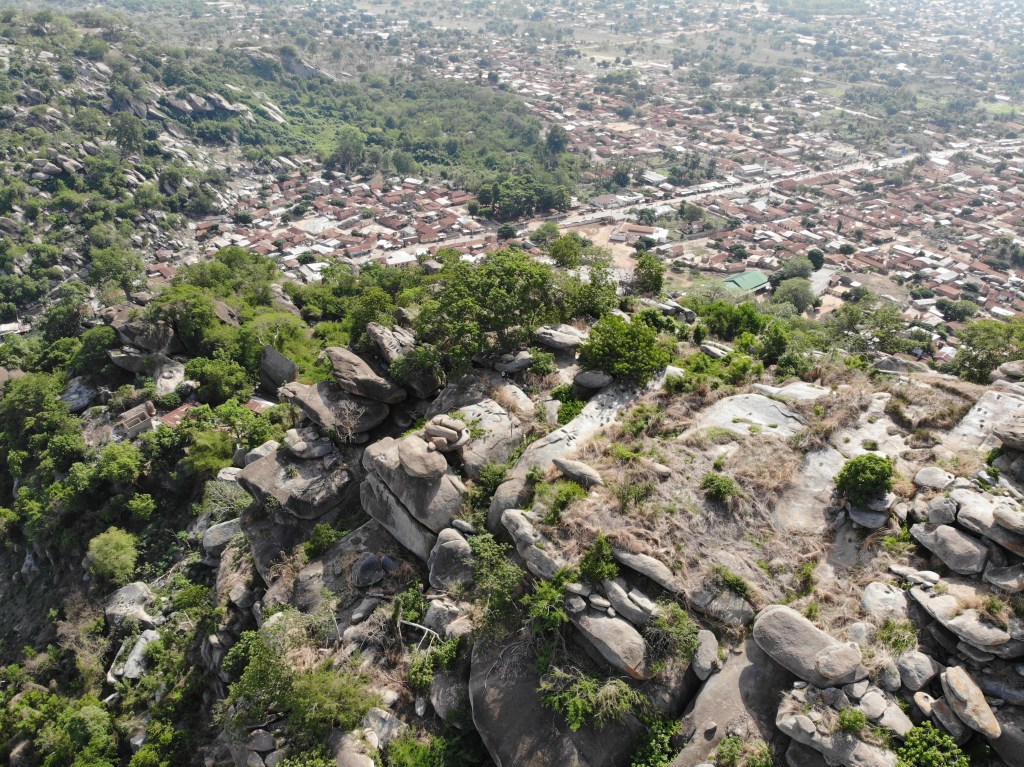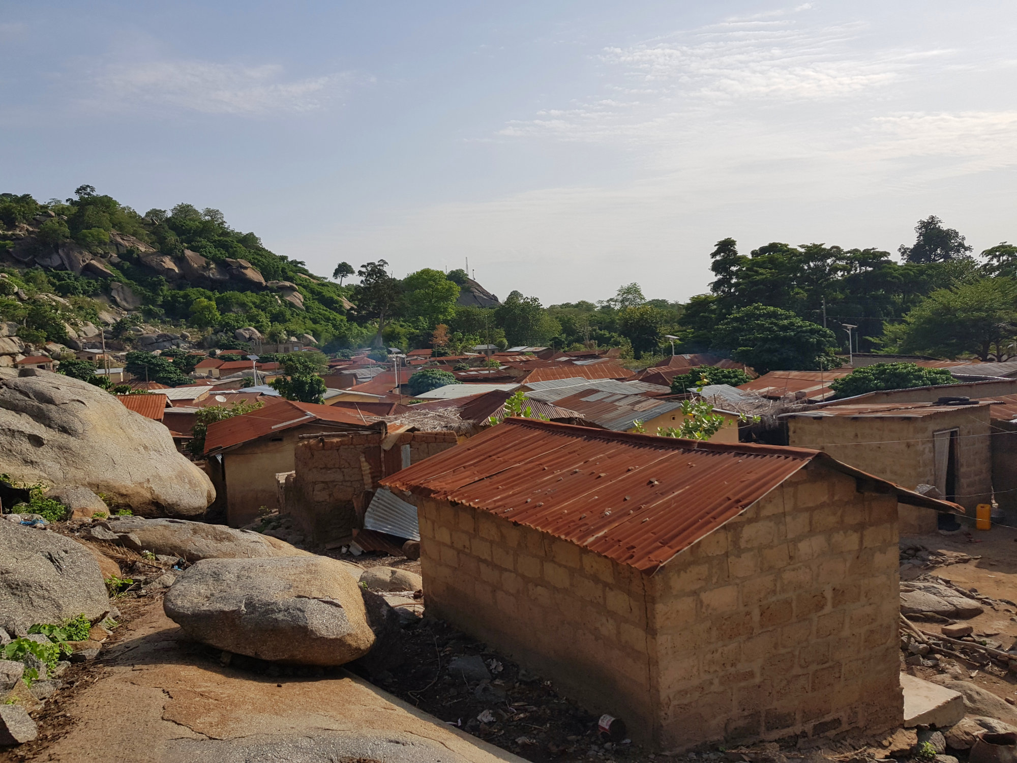 Da in der Gegend rund um Dassa-Zoumé wunderschöne Hügel zum Wandern einladen, beschließen wir trotz Nigeria-Visa-Stress uns einen lokalen Guide zu nehmen, um ein wenig mehr von der Landschaft Benins zu sehen und dabei den Kopf frei zu bekommen. Unser Wanderführer nimmt uns auf dem Gepäckträger seines Mopeds mit und wir rasen zu Dritt ziemlich waghalsig durch die schlaglöcherdurchsetzten Straßen um am Fuße einer der Hügel anzuhalten. Von hier aus beginnt bei knapp 40 Grad im Schatten der schweißtreibende Aufstieg eines der höchsten Hügel der Gegend. Dabei kommen wir an einer hoch über der Stadt gelegenen Opferstätte vorbei, wo laut unserem Guide regelmäßig eine Art Voodoo-Gottestdienst bzw. Opferungen abgehalten werden. Die leeren Gefäße, Tücher und Gruben rund um die Bäume bestätigen seine Aussage.