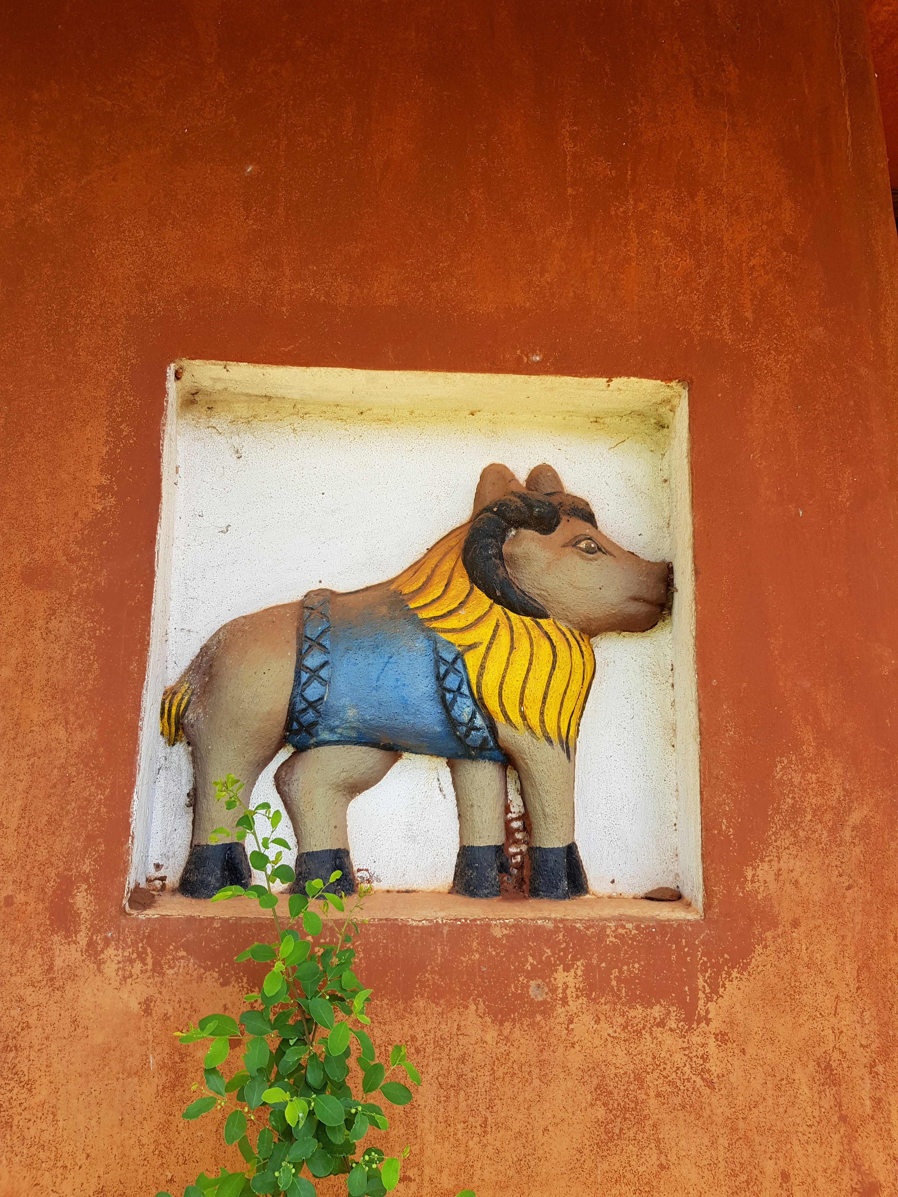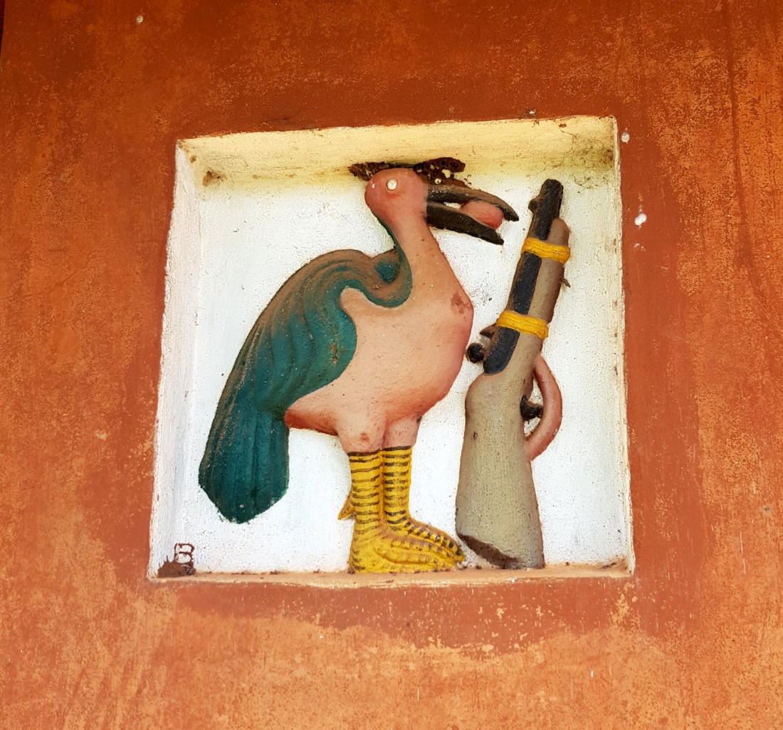 Noch im Pfannkuchen-Himmel schwelgend machen wir uns schließlich zum eigentlichen Ziel unseres Abomey Aufenthaltes auf: Die Besichtigung einer der vielen Königspaläste. Dazu muss man wissen, dass Abomey Hochburg des Fon-Volkes war und von Mitte des 17. Jhd. bis Ende des 19. Jhd. als Regierungsstätte für sämtliche Könige des Dahomey Königtums diente. Da jeder König einen eigenen Palast für seine Regierungszeit bekam, findet man hier entsprechend viele mehr oder weniger gut erhaltene Relikte aus dieser Zeit. Auf dem Weg zum Museum, das neben einem Königspalast auch zahlreiche Ausstellungsstücke aus der Königszeit beinhaltet, passieren wir bereits diverse aus Lehm gefertigte Mauern, in die kunstvoll Machtsymbole und Zeichen für den jeweiligen Regierenden eingearbeitet sind.