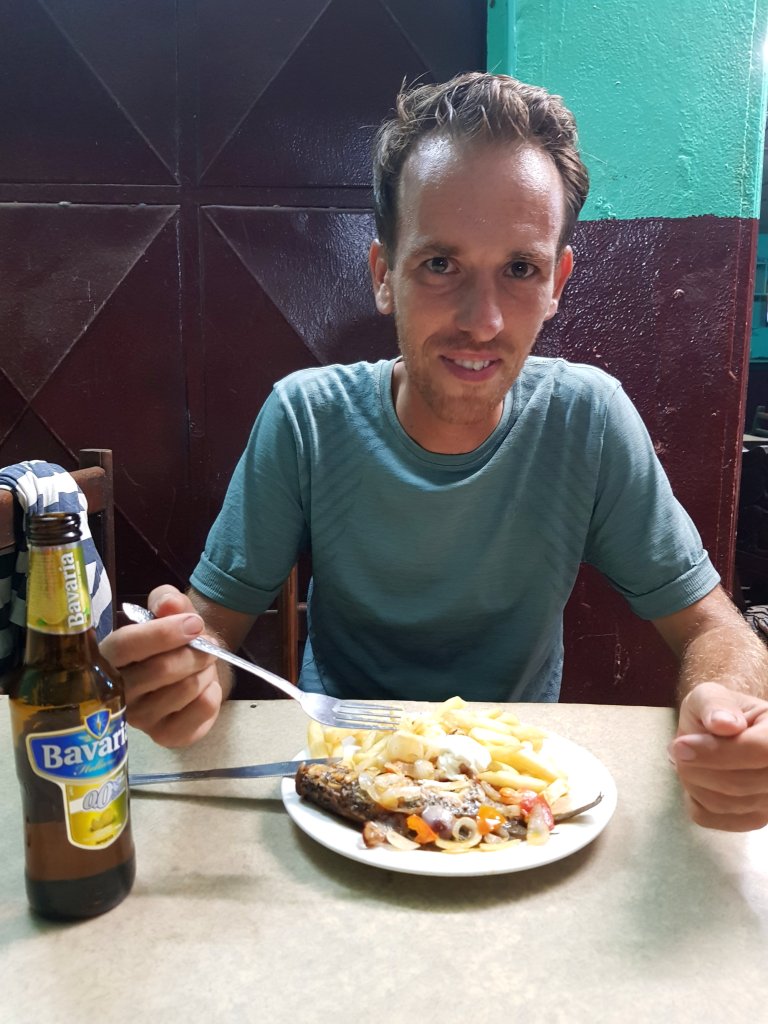 Als wir nach 6-stündiger Fahrt endlich wieder Teer unter den Reifen haben, ist es bereits Nachmittag und alle Versuche in der Nähe einen Wildcamping-Spot oder eine andere Unterkunft zu finden, scheitern. Es ist bereits dunkel, als wir endlich Lambaréné und damit die erste größere Stadt erreichen, von der wir wissen, dass sie ein paar annehmbare Übernachtungsmöglichkeiten aufweist. Nach einer nervenaufreibenden Fahrt durch die dunklen Straßen der Stadt, die scheints nachts viel belebter sind als tagsüber (von allen Ecken her eilen Fußgänger vorbei bzw. preschen Autos und andere Gefährte hervor; man muss dabei jeden Moment Angst haben, in einen Unfall verwickelt zu werden), finden wir dank ein paar hilfsbereiten Passanten endlich eine Pension in einem dunklen Hinterhof. Die Stromleitungen sind gerade so hoch angebracht, dass wir mit Rotkäppchen unten durchfahren können. Im Innenhof der Unterkunft angekommen, werden wir von einem nur mit einer kurzen Hose und einem weißen Feinripp-Unterhemd bekleideten Mann begrüßt. In gebrochenem Französisch versuchen wir ihm zu erklären, dass wir auf der Suche nach einer Übernachtungsmöglichkeit wären und gerne in seinem Innenhof parken bzw. campen würden. Der Besitzer scheint Mitleid mit uns zu empfinden, und erlaubt uns für eine Nacht hier zu parken – ohne Gegenleistung. Wir sind unendlich dankbar, dass wir nicht nochmals mit Rotkäppchen zurück auf die chaotischen Straßen Lambarénés müssen und bedanken uns überschwänglich bei unserem Gastgeber. Hungrig von der stundenlangen Fahrt ohne Pause machen wir uns schließlich zu Fuß mit einer Taschenlampe bewaffnet auf die Suche nach etwas Essbaren. Und tatsächlich finden wir im quirligen Treiben Lambarénés ein kleines Fisch-Lokal. Nachdem wir den hinterm Tresen schlafenden Wirt aufgeweckt und Fisch mit Reis bzw. Pommes bestellt haben, ziehen wir nochmals kurz los, um was zu Trinken zu kaufen. Im Restaurant gibt es keine Getränke – die muss man sich im Laden nebenan selbst besorgen. Und so sitzen wir schließlich zwischen ein paar neugierig immer wieder rüber schielenden Einheimischen in einem wohl typisch gabunischen Lokal und knabbern an unserem ziemlich hager ausgefallenen Fisch. Dazu ein Bier und eine Limo – was will man nach so einem Tag mehr?