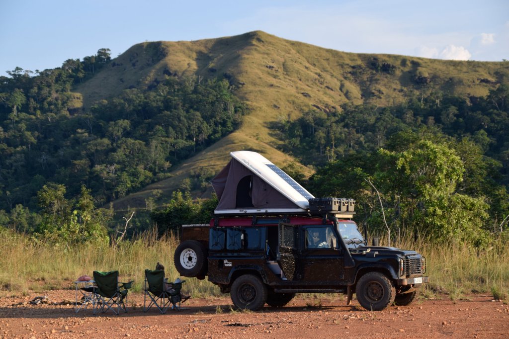 Der nächste Tag beginnt ohne Frühstück, dafür mit einer sehr rumpeligen und schlechten Straße zum Parkeingang. Nach gut einer Stunde Fahrt in Schritttempo beschließen wir an einem in unserer iOverlander-App eingezeichneten Stelle Halt zu machen, um vor Parkbesuch noch zu frühstücken. Und wer hätte es gedacht – genau dort steht ein uns allzu bekanntes Fahrzeug: Amy und Christos haben hier die letzte Nacht verbracht und kriechen leicht verschlafen aus ihrem Zelt, als sie hören, dass sich ein anderes Fahrzeug ihnen nähert. Beide sind über und über mit roten Punkten verziert, die ihnen am gestrigen Abend aggressive Mücken während des Aufbaus ihres Nachtquartiers und beim Kochen des Abendessens verpasst haben. Da haben wir ja mit unseren kleinen, nervigen Fliegen, die uns am gestrigen Tag über Stunden um den Kopf gekreist sind, glatt noch Glück gehabt.