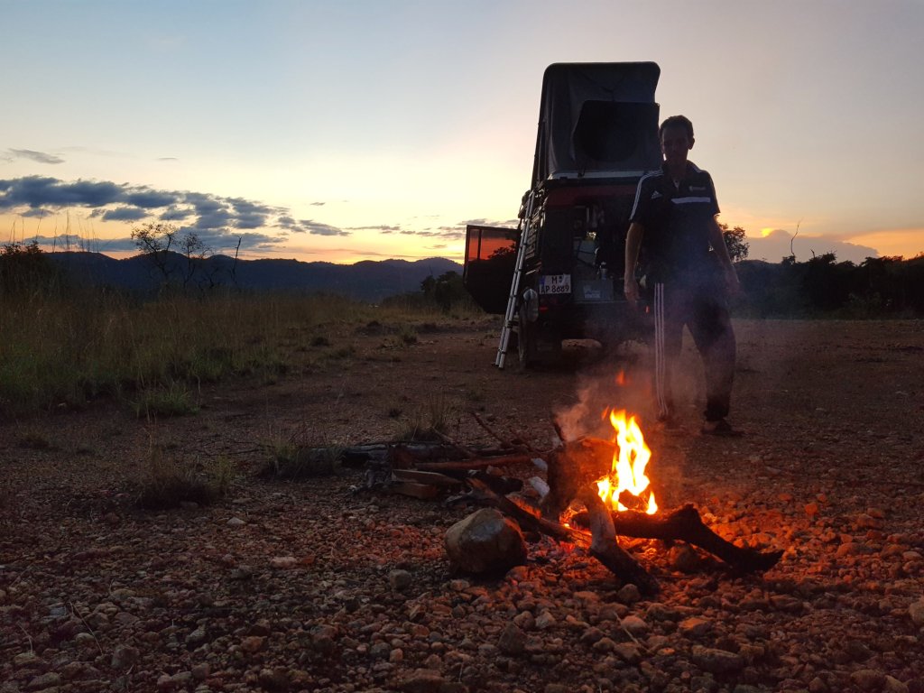 Abends gibt es wieder ein großes Lagerfeuer, um ungebetene tierische Gäste fernzuhalten. Nachdem wir genüsslich unsere Knorr Asia Fertignudeln verputzt haben und uns die Äste zum Befeuern der Flammen ausgehen, ziehen wir uns schnell in unser Dachzelt zurück. Man weiß ja nicht, was für ein Getier hier im wilden Busch Gabuns noch so rumschleicht und auf leichte Beute wartet!