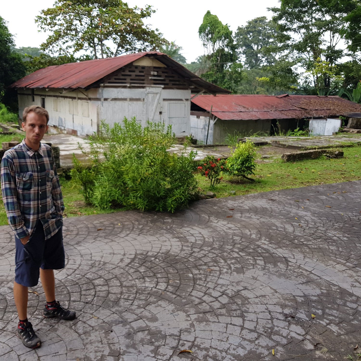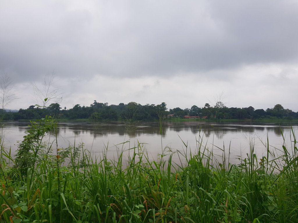 Das Prasseln des nächtlich immer stärker werdenden Regens und die Tatsache, dass sich die Regenmassen langsam, aber sicher ihren Weg in das Zeltinnere suchen, lassen uns am frühen Morgen aufwachen. Es ist kurz nach Morgengrauen und um uns herum herrscht bereits reges Treiben. Nicht nur wir, sondern auch einige Gäste haben die vergangene Nacht in der Unterkunft in Lambaréné verbracht und sind bereits emsig dabei sich lautstark über den Hinterhof hinweg zu unterhalten. An weiteren Schlaf ist nicht mehr zu denken, und so klettern wir raus aus unserem Zelt ins Freie. Als nächstes gilt es den Schlüssel für die freistehende, auf Holzstelzen gebaute Hütte neben dem Haupthaus zu ergattern, die man balancierend über Holzbretter trockenen Fußes erreichen kann. Hinter der windschiefen Tür befindet sich nämlich das Bad, in dem wir uns nur mit einer Taschenlampe bewaffnet, da die Glühbirne den Geist aufgegeben zu haben scheint, kurz frisch machen.