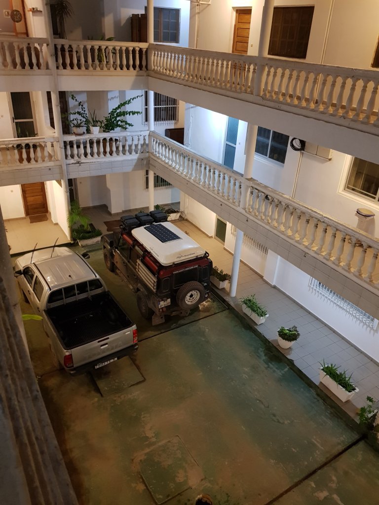 Aber gut, die haben sicher noch nicht so viel erlebt wie unser Land Rover. Als wir aussteigen, werden wir aus dem 3ten Stock winkend schon von Johanny erwartet. Er kam vor mehreren Jahren in den Kongo, um dort zu arbeiten und hier in der Ölbranche gutes Geld zu verdienen. Aktuell ist er als Health & Safety Beauftragter für Ölplattformen zuständig, plant aber sich zeitnah nach Kinshasa versetzen zu lassen, wo er ein noch attraktiveres Angebot auf ihn wartet. Auf dem Balkon, mit einem kühlen Bier ausgestattet, lauschen wir Johannys Erzählungen über sich, sein Leben und seine Reisen. Er hat bereits viel von der Welt gesehen und genießt es sichtlich, sich mit uns auszutauschen und mit uns den Abend zu verbringen. Wieder einmal bestätigt sich, dass Couchsurfing eine tolle Option ist, um neue interessante Leute kennenzulernen. Später am Abend fallen wir glücklich in das frisch bezogene Bett in einem kleinen Zimmer mit Blick aufs Meer. Zuvor wurde uns von Johanny noch sein Wohnungsschlüssel in dir Hand gedrückt mit den Worten, wir sollen uns hier wie zuhause fühlen und können gerne länger bei ihm bleiben. Auch die Waschmaschine wartet bereits darauf eine große Ladung Wäsche am nächsten Morgen für uns sauber zu schleudern. Doch bis dahin kann uns nichts davon abhalten tief und fest einzuschlummern.