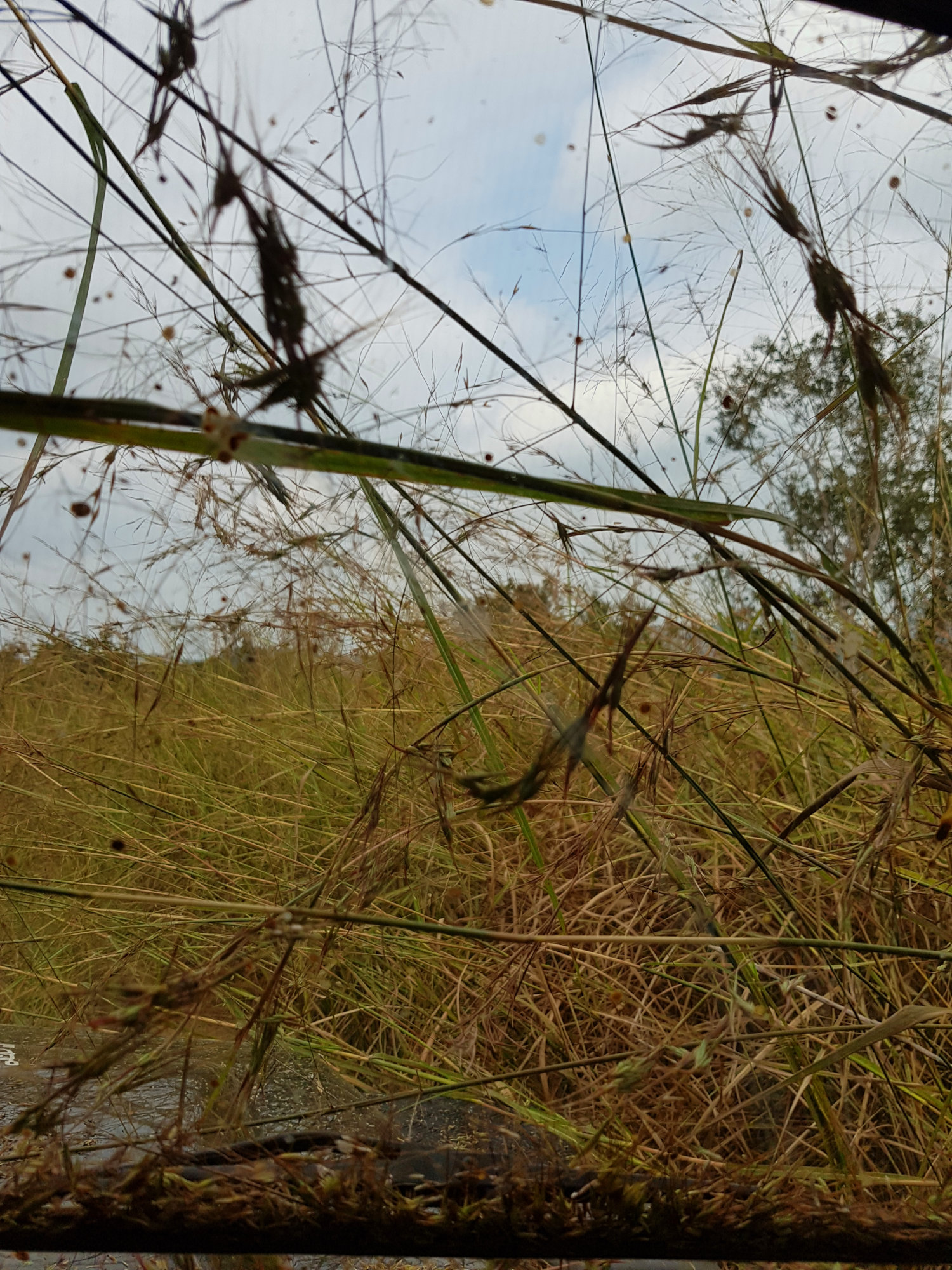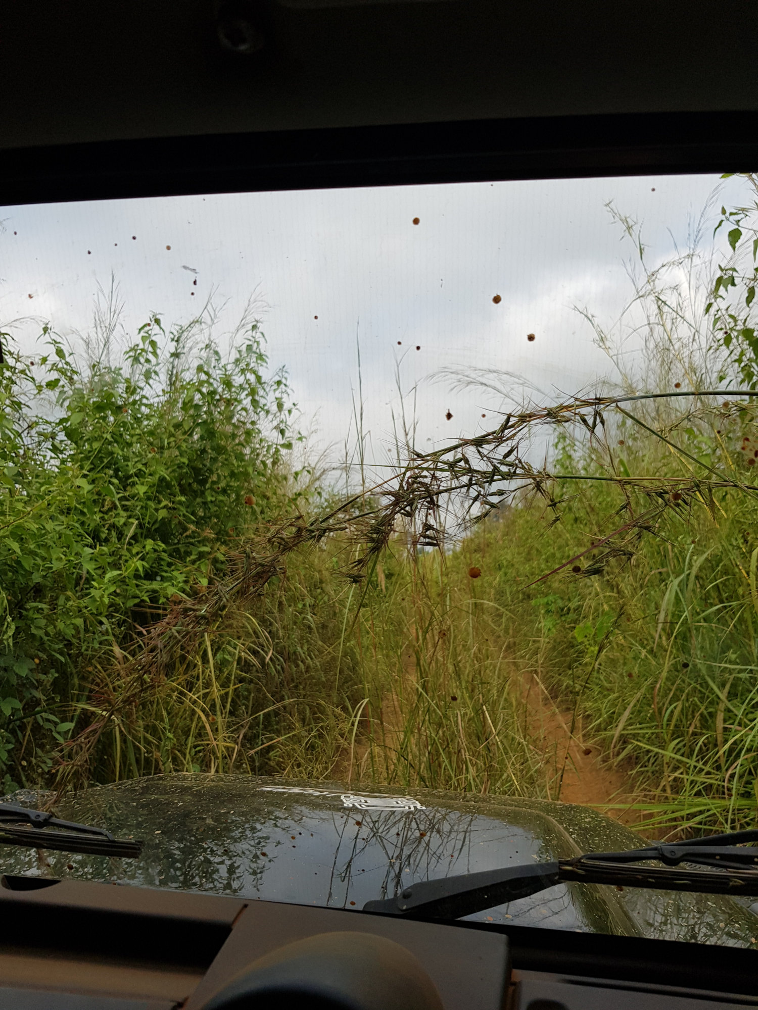 So schnell geben wir nicht auf! Wir fragen ein paar mit Bierflaschen lässig an einem Zaun lungernde Jugendliche, die uns bereits teils belustigt, teils mitleidig von der Ferne aus angegrinst hatten. Als wir näherkommen und nach dem Weg zur Grenze nach DRC fragen, deuten die jungen Männer mit den Händen in die Richtung des hochgewachsenen Gebüschs und wir verstehen nicht ganz, was sie uns damit sagen wollen. Wir fragen erneut, ob es eine Straße geben würde, auf der wir MIT unserem Auto über die Grenze fahren können. Wieder nicken die Jungs und erneut zeigen sie mit überzeugter Miene und Handzeichen in Richtung des hohen Grases. Es beginnt uns zu dämmern – hier scheint es vor einiger Zeit eine Straße gegeben zu haben, diese ist aber derart zugewachsen, dass man sie nicht mehr mit bloßem Auge erkennen kann. Gefühlt seit Monaten oder gar Jahren ist hier wohl niemand mehr mit einem Auto langgefahren, weshalb der Weg nicht mehr erkennbar ist. Wir kratzen unsere letzten Münzen des Kongo-Francs zusammen und bitten einen der Einheimischen uns den Weg zu zeigen. Dieser scheint sich über den Zeitvertreib und den ihm winkenden kleinen Zuverdienst zu freuen, läuft kurz hinter eine der Lehmhütten und kramt einen alten Motorroller hervor. Damit setzt sich unser Gespann in Bewegung. Er scheint mühelos den Weg durch das hohe Gras zu finden, während wir nur noch Stroh und Gras vor der Windschutzscheibe sehen, ihn kaum erkennen können und ihm blindlings in den Busch folgen.