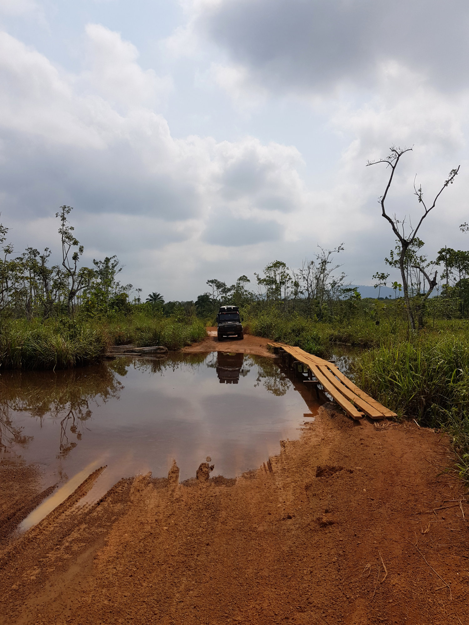Während die Kinder uns zur Weißglut treiben, sind die Erwachsenen, auf die wir treffen, umso freundlicher. Immer, wenn wir kleine Dörfer durchqueren, fragen wir Erwachsene am Wegesrand, ob denn die Strecke bald besser werden würde, wir noch auf dem richtigen Weg seinen und wie lange es noch bis zur Hauptstraße dauern würde. Alle nicken freudig und bestätigen, dass die Strecke immer besser werde. Doch leider ist meist das Gegenteil der Fall. Außerdem fällt uns auf, dass wir häufig „Chinois, chinois“ gerufen werden – also „Chinesen, Chinesen“. Scheints sind bis auf vermeintlich illegale chinesische Holzarbeiter hier noch keine weißen Touristen in den letzten Jahren durchgekommen, was dazu geführt hat, dass die Kinder alle Weißen als Chinesen interpretieren und dann auch so bezeichnen. Das erklärt natürlich auch die große Aufregung der Kinder über das Auto und die weißen Insassen.Während wir uns bis kurz vor Dunkelheit durch die hohen Sträucher entlang des Trampelpfades kämpfen, geht es mir gesundheitlich von Stunde zu Stunde schlechter. Die Hitze, die Anspannung und die vielen Kilometer Fußmarsch haben mir den Rest gegeben. Doch es hilft nichts. Wir wissen, dass wir jetzt nicht mehr umdrehen können bzw. wollen und die einzige Lösung darin besteht, schnellstmöglich wieder auf eine befahrbare Straße zu gelangen und damit eine größere Ortschaft zu erreichen, wo vielleicht ein Arzt aufzutreiben ist. Kurz nach Einsetzen der Dunkelheit erreichen wir endlich eine Weggabelung, die auf eine zwar sehr ausgewaschene, aber zumindest autobreite Sandstraße führt und tatsächlich treffen wir hier auch auf das erste vierrädrige Gefährt seit mehr als einem Tag. Doch es bleibt uns keine Zeit, uns groß über die wiedergefundene Straße zu freuen, denn es gilt im Stockdunkeln einen Übernachtungsplatz ausfindig zu machen. Die Suche nach einem Wildcamping Spot erweist sich als unmöglich, da es einfach zu dunkel ist, um einen unbewohnten und sicheren Ort für die Nacht aufzutreiben. Nach einer weiteren 1-stündigen Fahrt über die holprige Straße in vollkommener Dunkelheit beschließen wir in einem Dorf Halt zu machen und nach einem Übernachtungsplatz zu fragen. Wir stöbern mit unserem Autoscheinwerfer einen Mann mit einem Fahrrad am Straßenrand auf und dieses Mal ist das Glück auf unserer Seite: Der Mann gehört zu einer katholischen Mission nicht weit von der Straße und bietet uns unvermittelt an uns dort übernachten zu lassen. Ein riesiger Stein fällt uns vom Herzen. Er schwingt sich auf sein klappriges Fahrrad und wir folgen ihm in die Dunkelheit bis zu einem kleinen, ordentlich wirkenden Gebäude, vor dem wir parken und unser Zelt aufschlagen dürfen. Uns wird sogar eins der Missionszimmer angeboten, doch das lehnen wir dankend ab. Während Max vollkommen fertig von der 14-stündigen Fahrt über Stock und Stein erst einmal sich ein wohlverdientes Bier gönnt, genehmige ich mir eine weitere Schmerztablette und lege mich mit Fieber & Schmerzen schlafen.