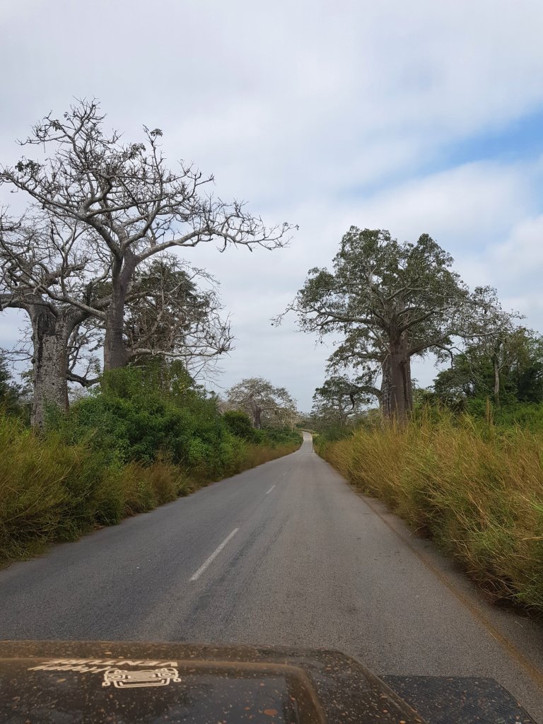 Am nächsten Morgen, nachdem wir noch Brot, frisches Obst & Gemüse und eine neue Handykarte für Angola gekauft haben und uns mit ein paar Klamotten bei unserem Nachtwächter für die Übernachtung auf deren Hof bedankt haben, machen wir uns auf in Richtung Küste. Unser Ziel ist N’Zeto – ein Strandabschnitt an dem es laut unserer Recherche Meeresschildkröten geben soll, sowie eine kleine Ecolodge. Es geht vorbei an malerischen Landschaften und über Straßen, die rechts & links von hohen Baobab-Bäumen gesäumt sind.