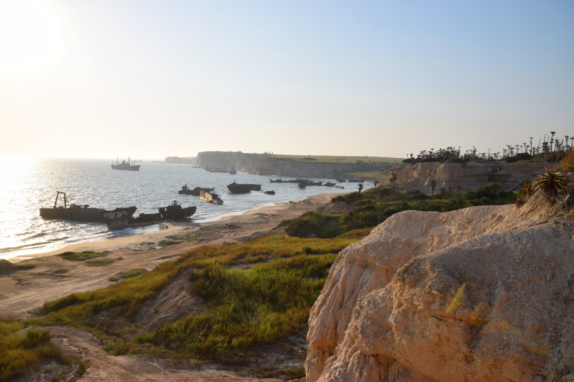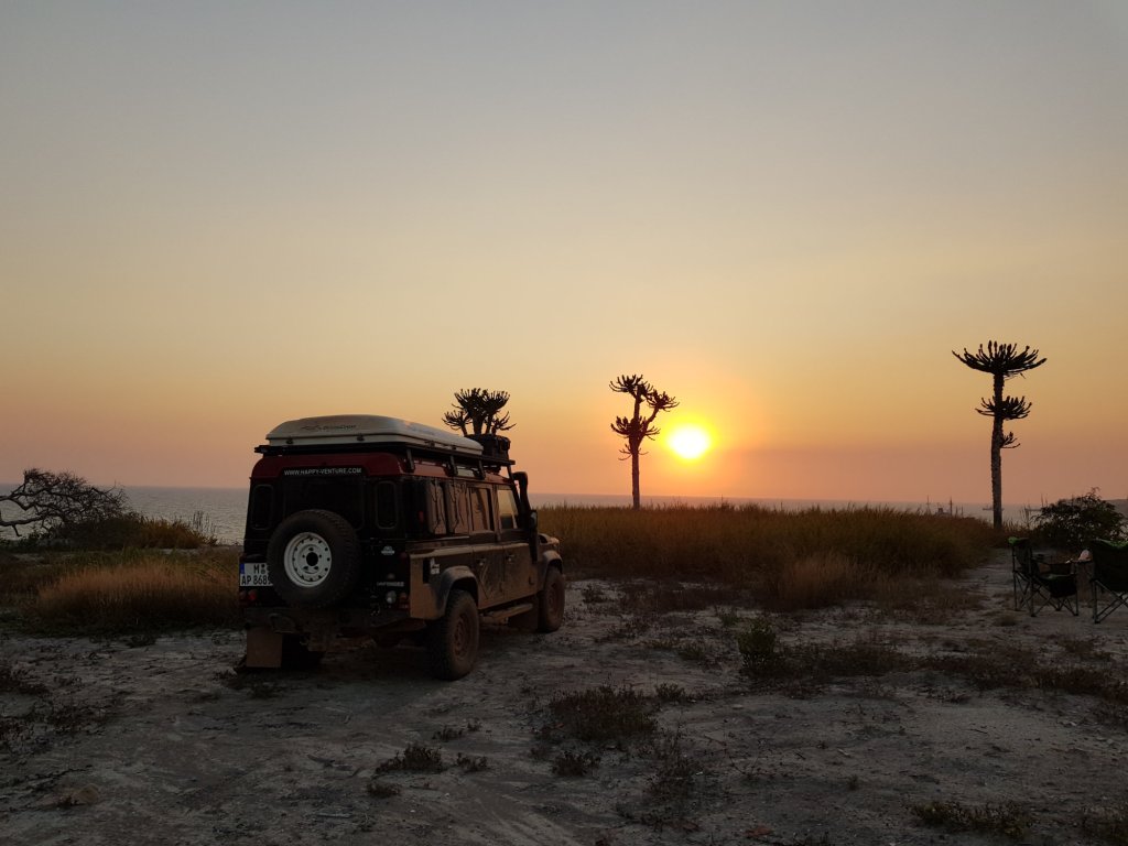 Vom Plateau aus hat man einen fantastischen Ausblick auf das Meer und den davor liegenden Strand, an dem unzählige Schiffe (heimisch wie ausländische Schiffe von Konkurs gegangenen Schiffsunternehmen) ihr rostiges Dasein fristen. Eine bizarr romantische Kulisse, die bei Sonnenuntergang nahezu kitschig wirkt. Als wir dann auch noch abends von einem Rascheln hochschrecken und feststellen, dass uns Hasen an unserem Stellplatz besuchen, beginne ich langsam zu realisieren, dass Angola wohl ein wahrer Geheimtipp ist. Bereits an Tag 3 unserer Angola-Reise bin ich begeistert von der Freundlichkeit, Natur & den einzigartigen Kulissen dieses Landes.