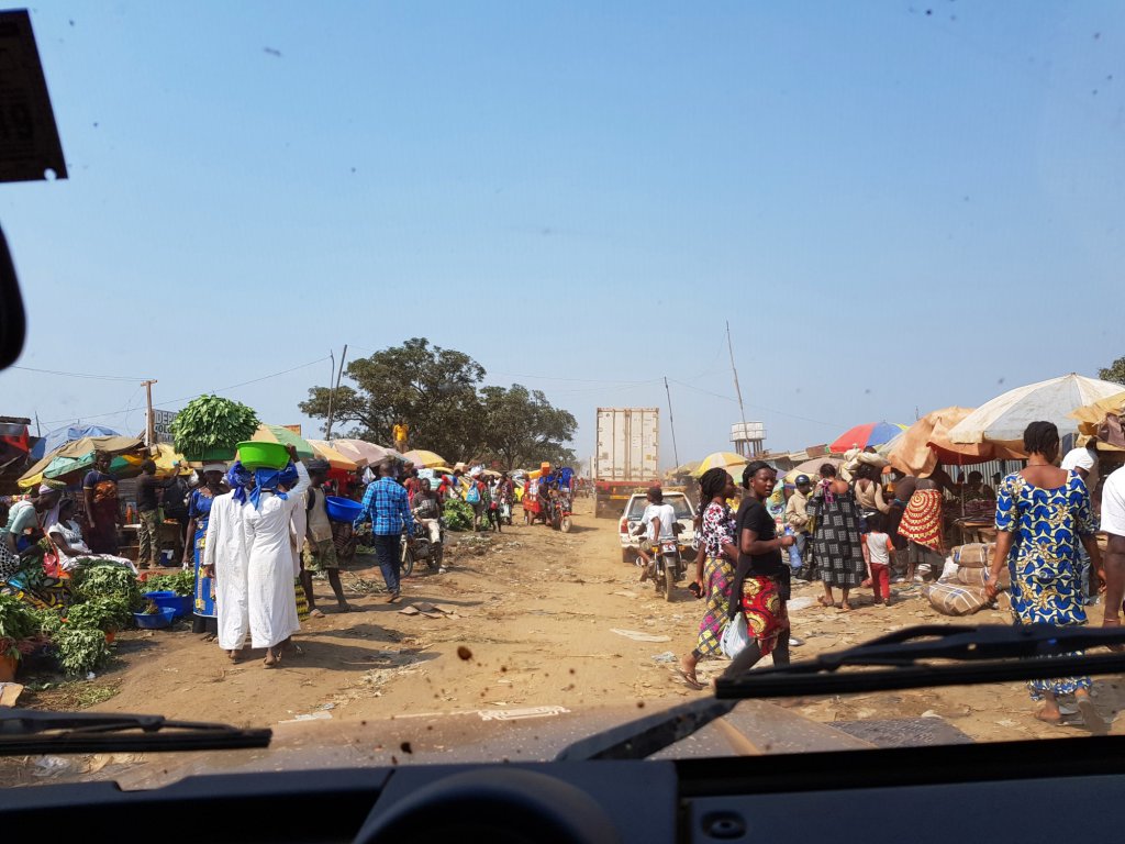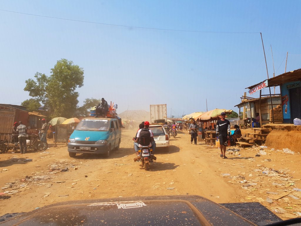 Nachdem wir erfolgreich den Schlagbaum hinter uns gelassen haben, geht es rein in die wohl bisher dreckigste und wuseligste Grenzstadt, die wir auf unserer Reise gesehen haben. Wir bahnen uns unseren Weg vorbei an Menschenmassen, über Schlaglöcher durchzogene Sandpisten und vorbei an liegengebliebenen Autos & plötzlich mitten auf der Straße parkende, vollkommen überladene LKWs. Beim Blick aus dem Fenster sieht man neben dem aufgewirbelten Sand & Staub vom vorherfahrenden Auto oder Motorradtaxi ein buntes Treiben an Menschen, Tieren und jede Menge Müll, der entweder kreuz und quer am Boden liegt, oder in einer Ecke angezündet wurde und sorglos vor sich hinqualmt. Verkäufer von Obst, Gemüse, chinesischen Plastikwaren und Hühnern (lebend wie bereits geschlachtet) mischen sich unter aufgebrachte Kunden. Der Geruch & das Stimmengewirr ist dabei kaum zu ertragen in der bereits unbarmherzig vom Himmel brennenden Sonne.