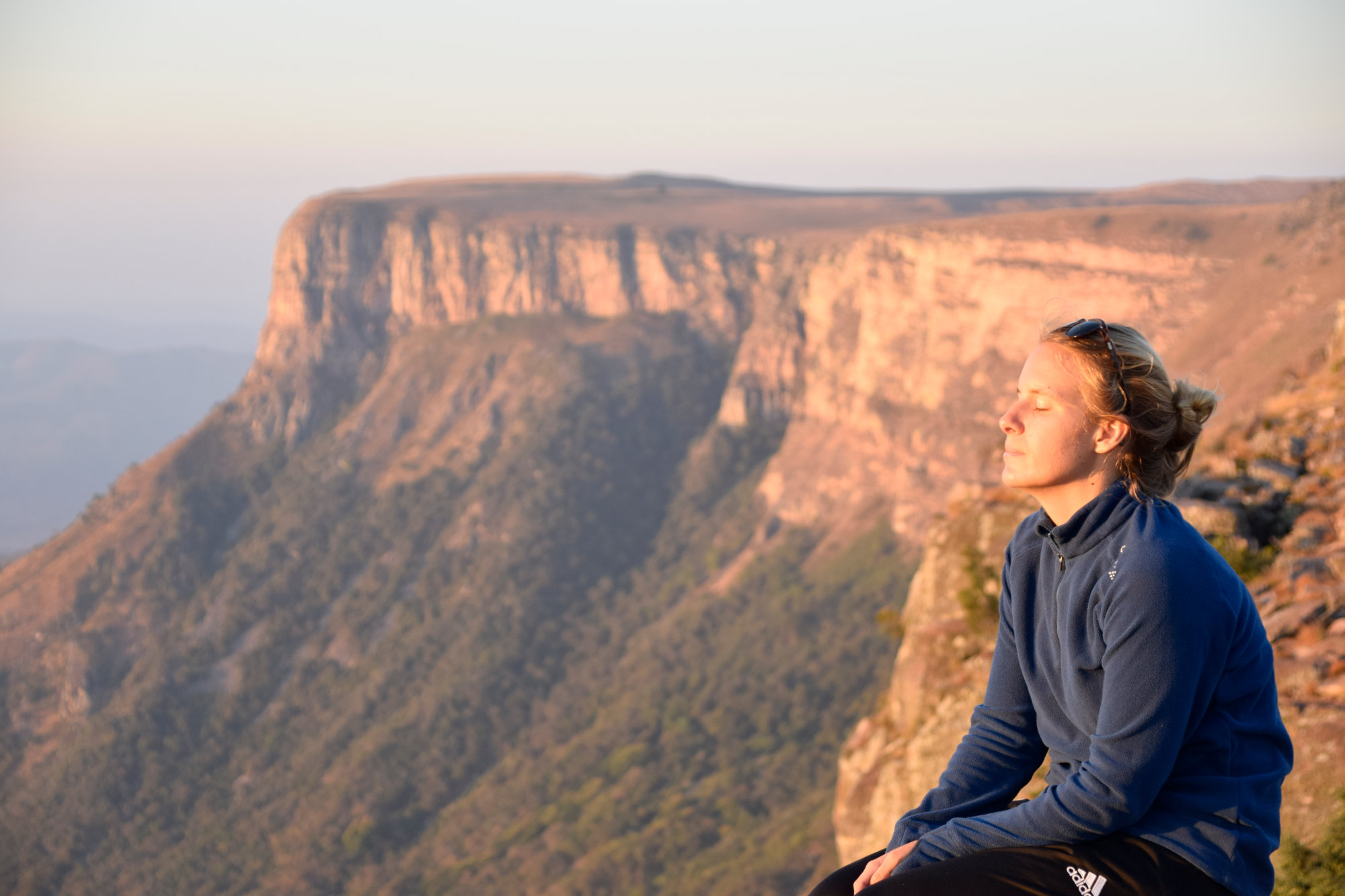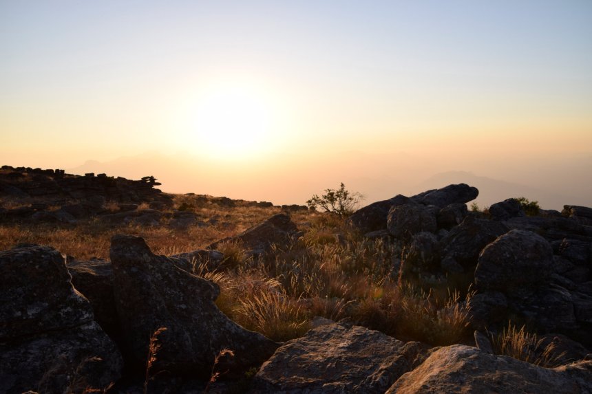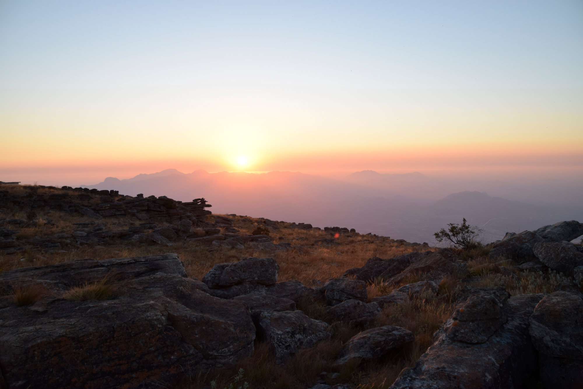 Wir werden von einem bunten Farbspiel am Himmel über dem Steilhang Serra da Leba begrüßt. Es ist ein unbeschreibliches Gefühl am Rand der Klippe auf 2.200 Meter zu stehen, die kalte, frische Morgenluft im Gesicht zu spüren und auf die 1.200 Meter tiefer gelegene Ebene zu blicken. Unsere Angst vom Vorabend scheint lächerlich und unbegründet und nachdem wir uns am Morgenhimmel sattgesehen haben, fahren wir wie euphorisiert durch den Steingarten, den wir bereits am Tag zuvor bei der Anfahrt nach Tundavala passiert hatten und machen dort spontan Halt, um einen kleinen morgendlichen Kletter-Spaziergang durch die surrealen Felsformationen, die an eine Mondlandschaft erinnern, zu unternehmen.