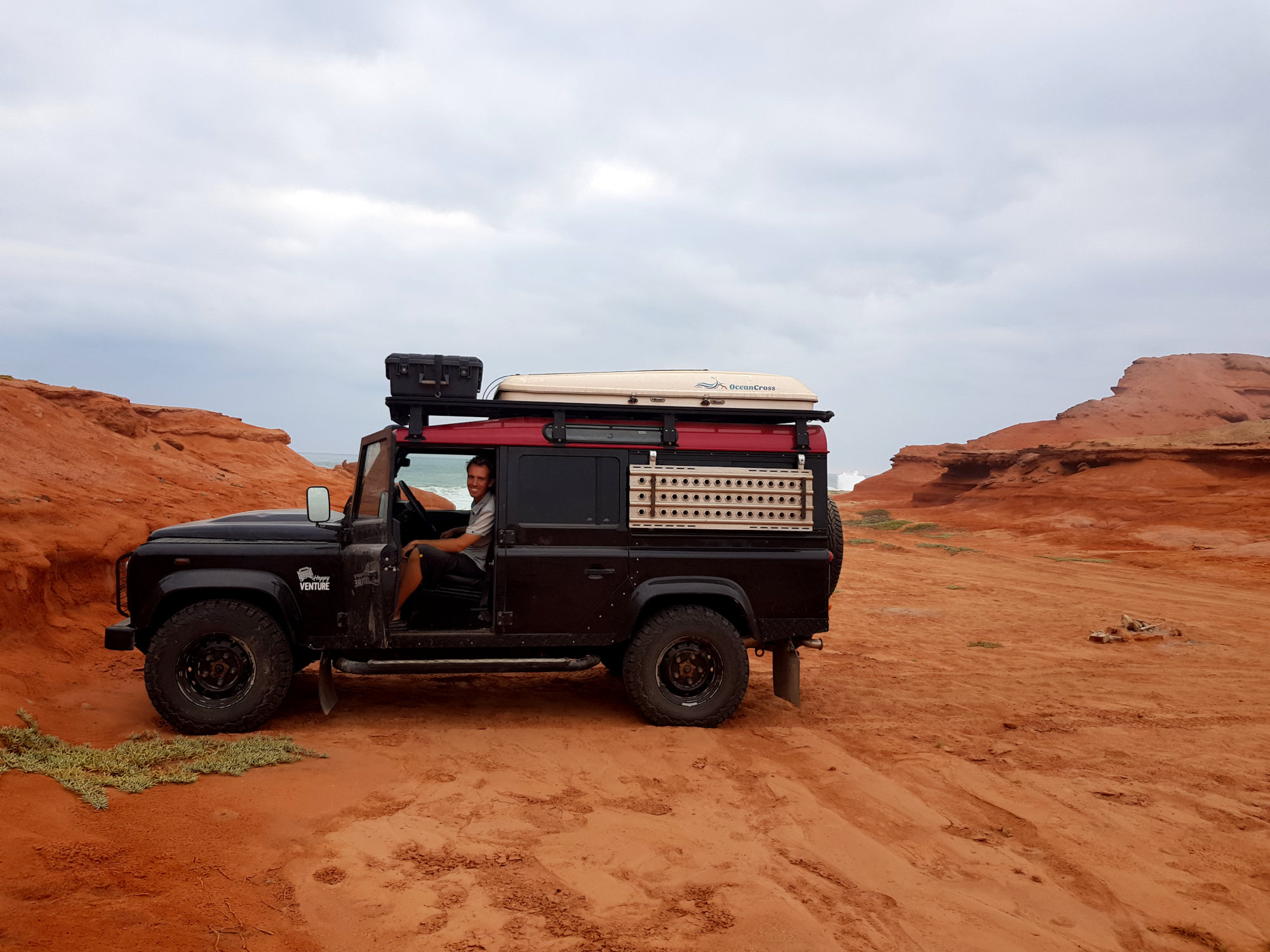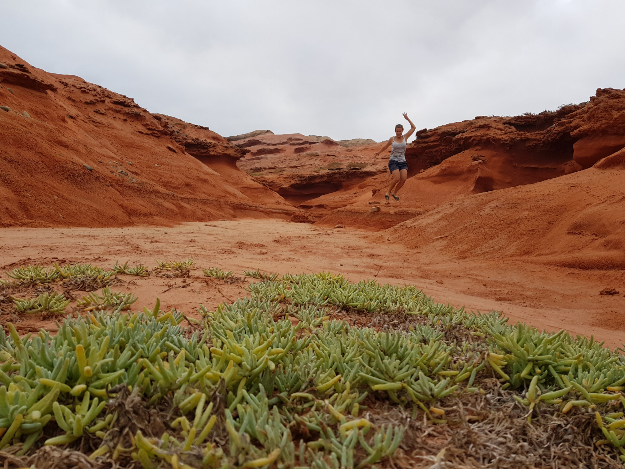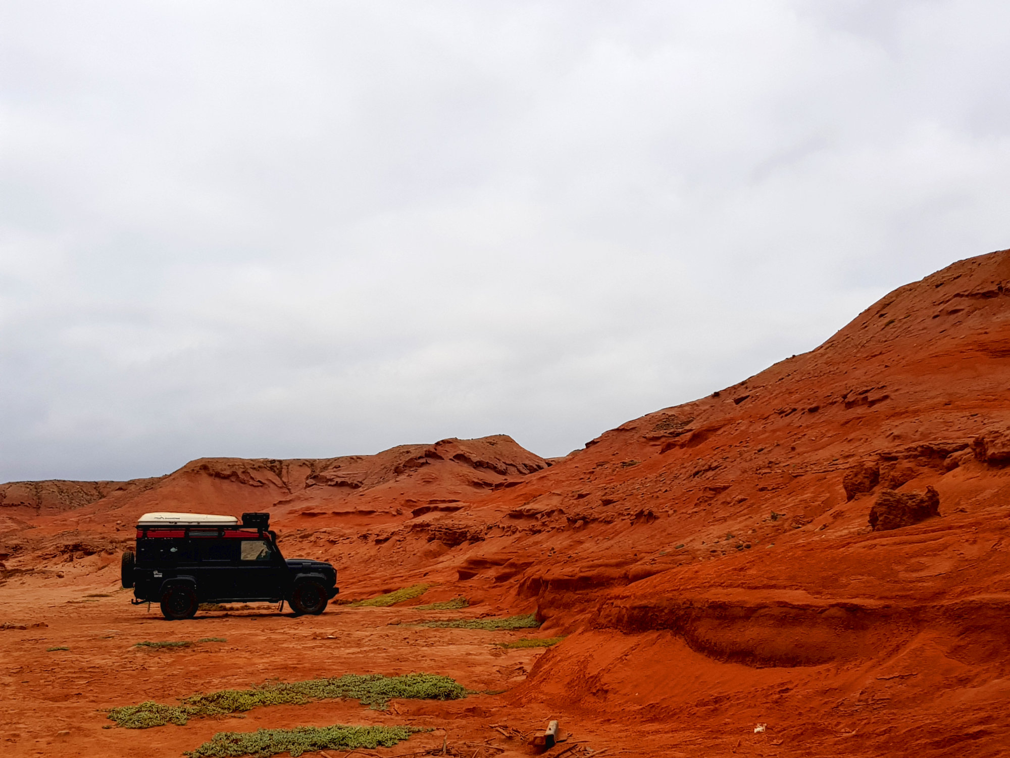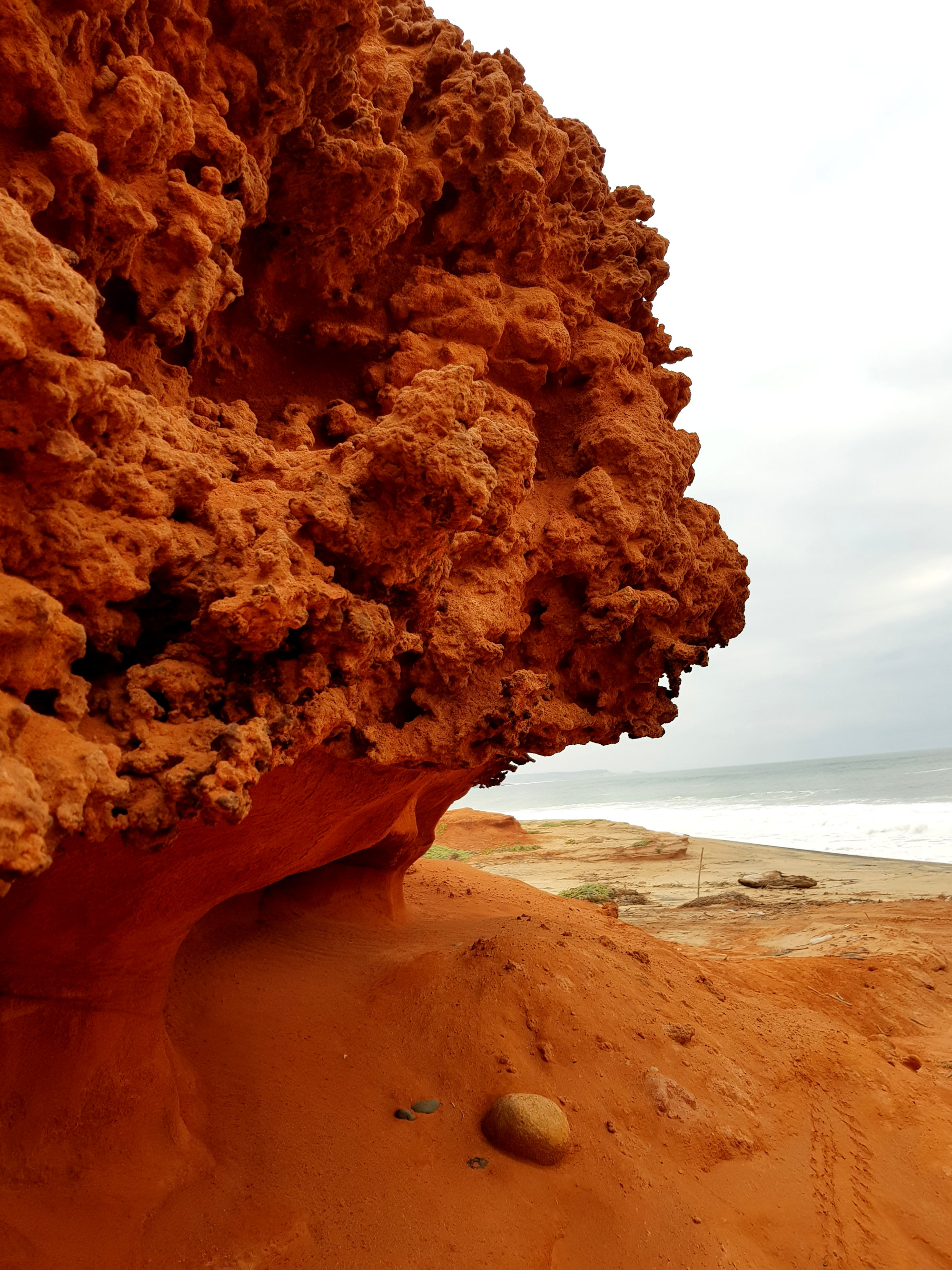 Da der Himmel leicht bewölkt ist, sich leichter Regen und Sturm ankündigt und hier weit und breit keine offizielle Übernachtungsmöglichkeit zu sein scheint, halten wir schon früh Ausschau nach einem passenden Übernachtungsplatz. Als die Straße einen leichten Linksknick macht und nun wie schnurgerade parallel zur Küste verläuft, empfängt uns roter Sandstein, der sich in bizarren Formationen über Kilometer am Meer entlang windet. Die Szenerie ist bezaubern und trotz des nicht sonderlich freundlichen Wetters freuen wir uns auf die nächste Übernachtung unter freiem Himmel. Nach einigen gescheiterten Anläufen rechts von der Straße einen geeigneten, windgeschützten und nicht von der Straße einsehbaren Stellplatz zu finden, entdecken wir schließlich den perfekten Schlafplatz: Wildromantik pur empfängt uns nur wenige hundert Meter entfernt von der kaum befahrenen Hauptstraße direkt am Meer. Wasser hat hier tiefe Gräben in den roten Sandstein gewaschen und bietet damit die perfekten Auskerbungen, um unser Rotkäppchen wind- und wettergeschützt in einer uneinsehbaren Bucht zu parken. Erneut ein traumhafter Wildcampingplatz mit Meerrauschen – wir sind begeistert.