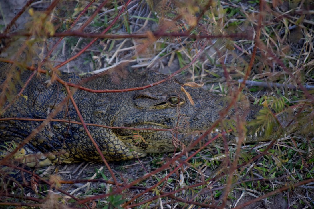 Als wir zu Fuß in Richtung Okavango Fluss schlendern, bietet uns Hannes netterweise an, uns mit seinem Boot mitzunehmen und ein paar der 3 Meter langen Krokodile zu zeigen, die faul am Rande des Ufers liegen und auf Beute warten.